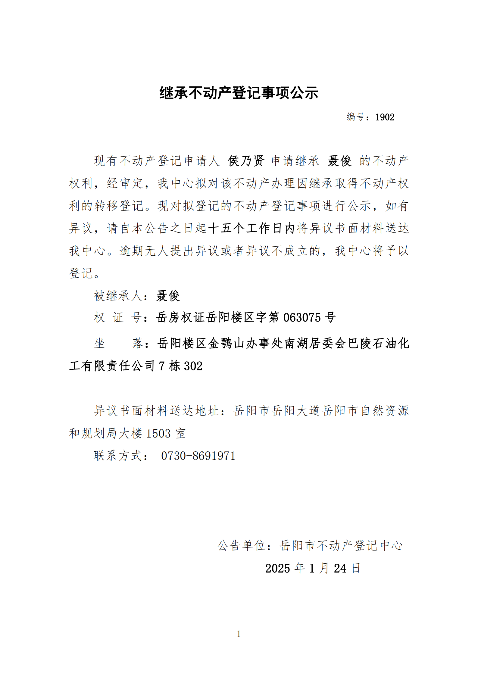 继承不动产登记公示 编号:侯乃贤(1902)