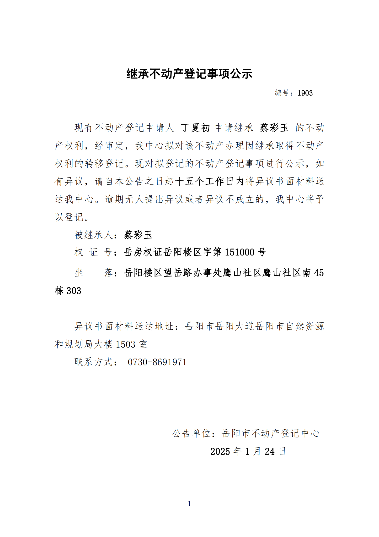 继承不动产登记公示 编号:丁夏初(1903)