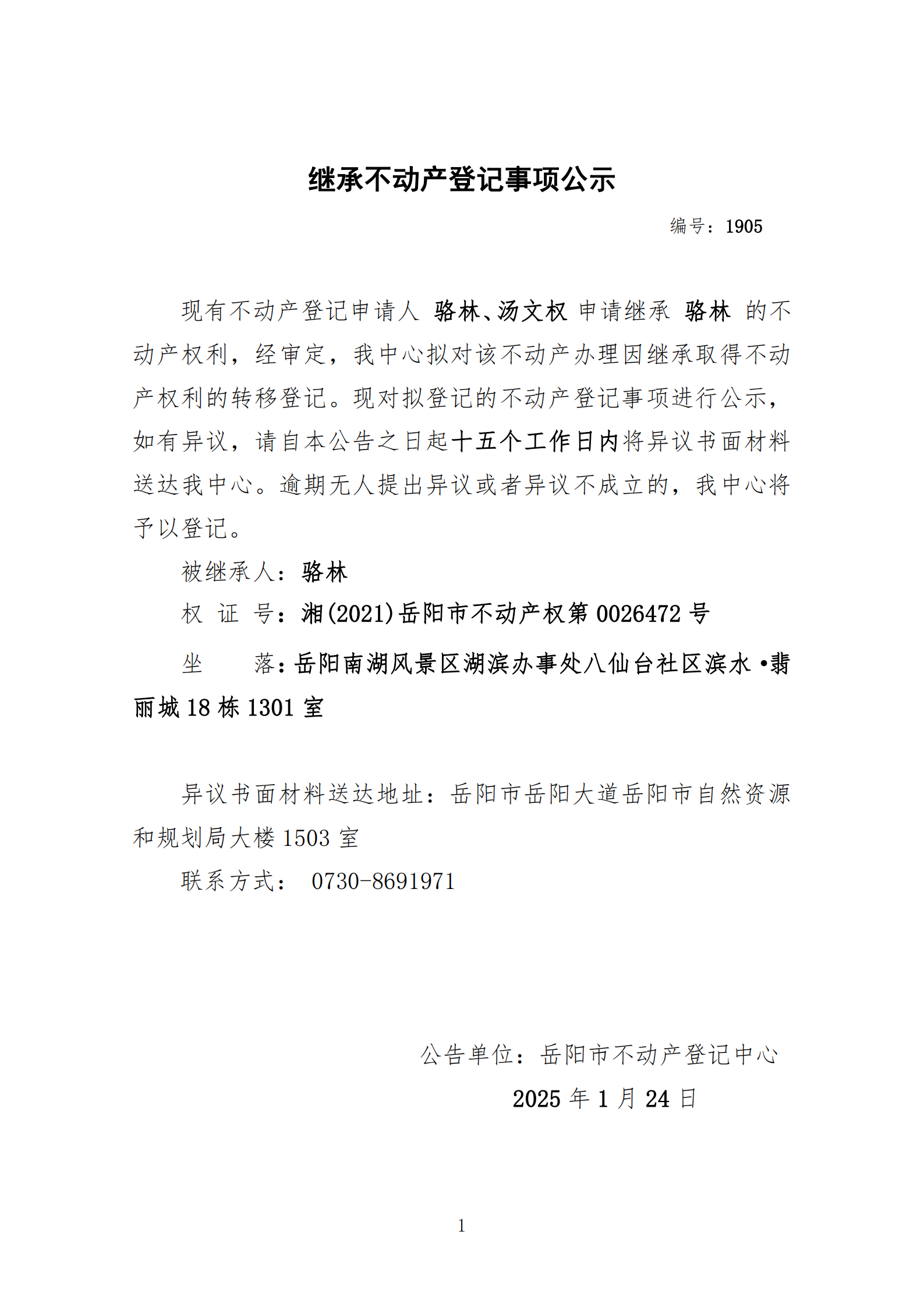 继承不动产登记公示 编号:骆林、汤文权(1905)