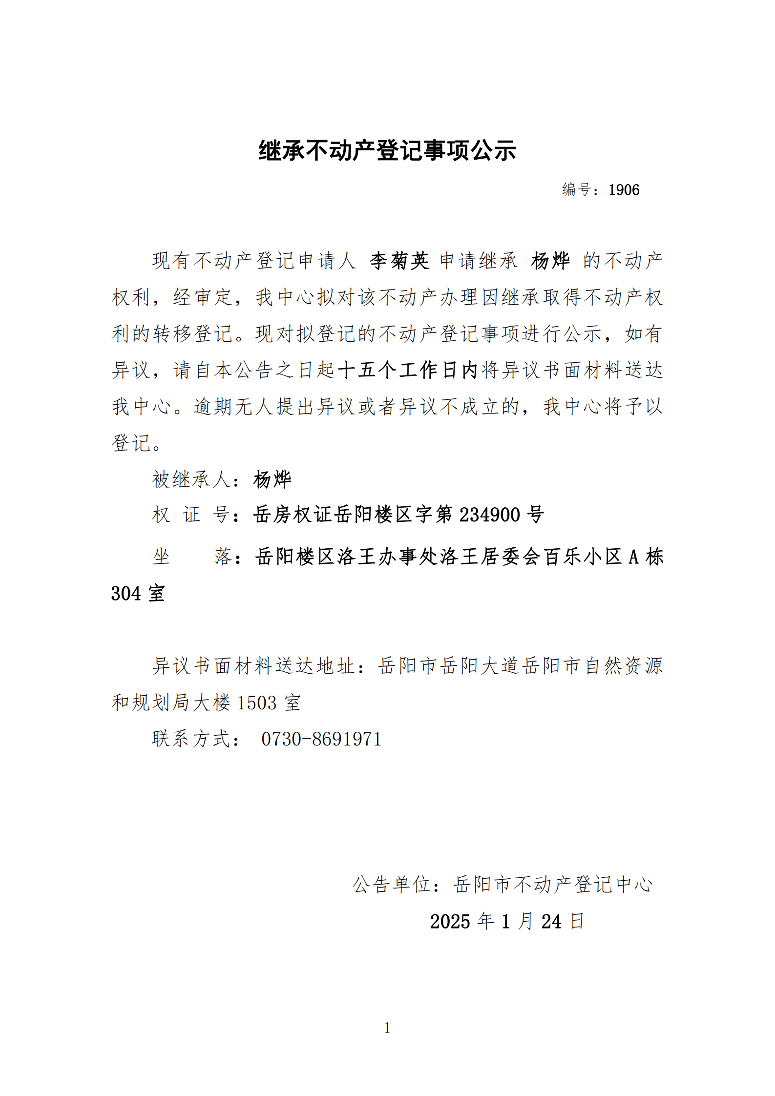 继承不动产登记公示 编号:李菊英(1906)