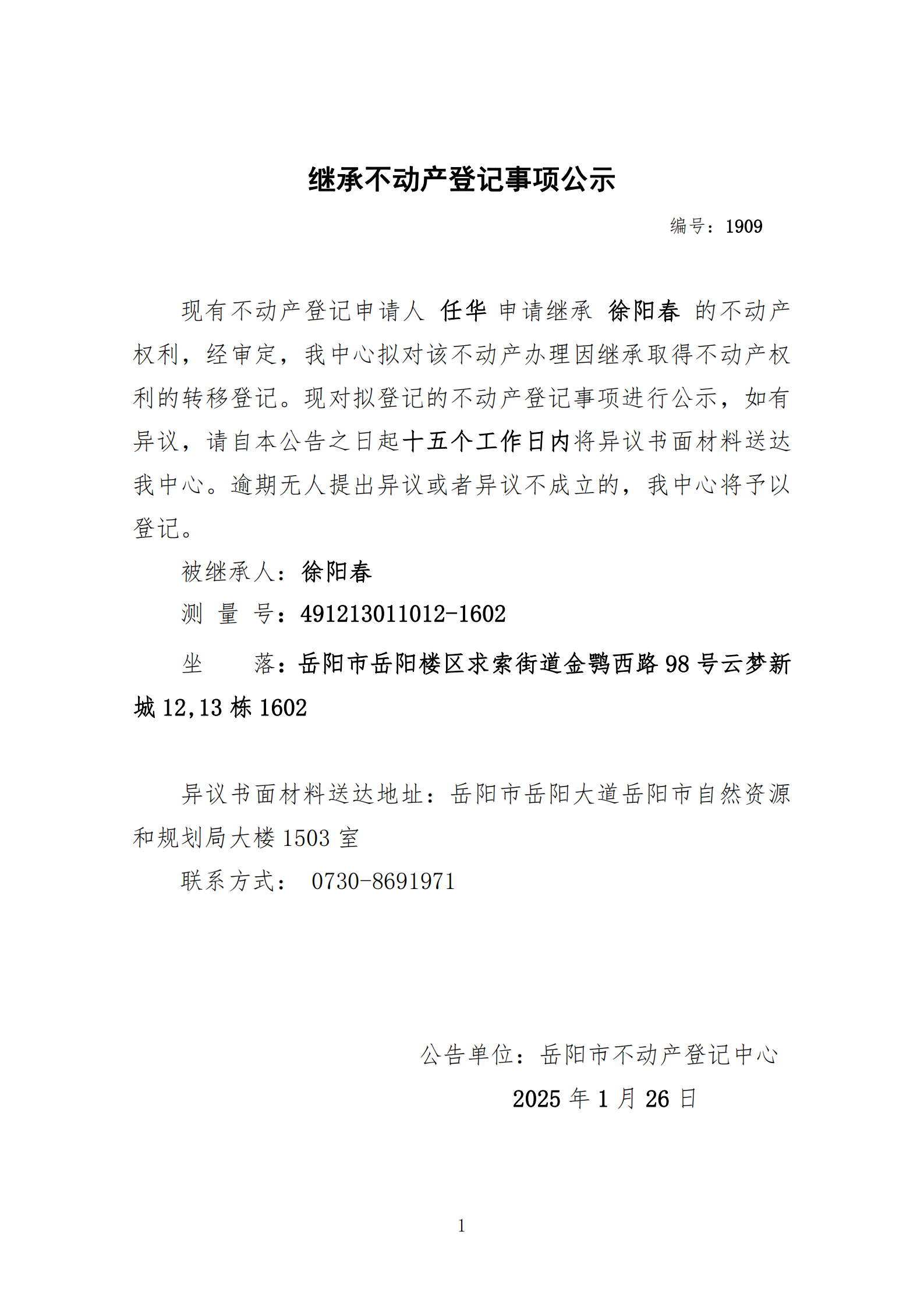 继承不动产登记公示 编号:任华(1909)