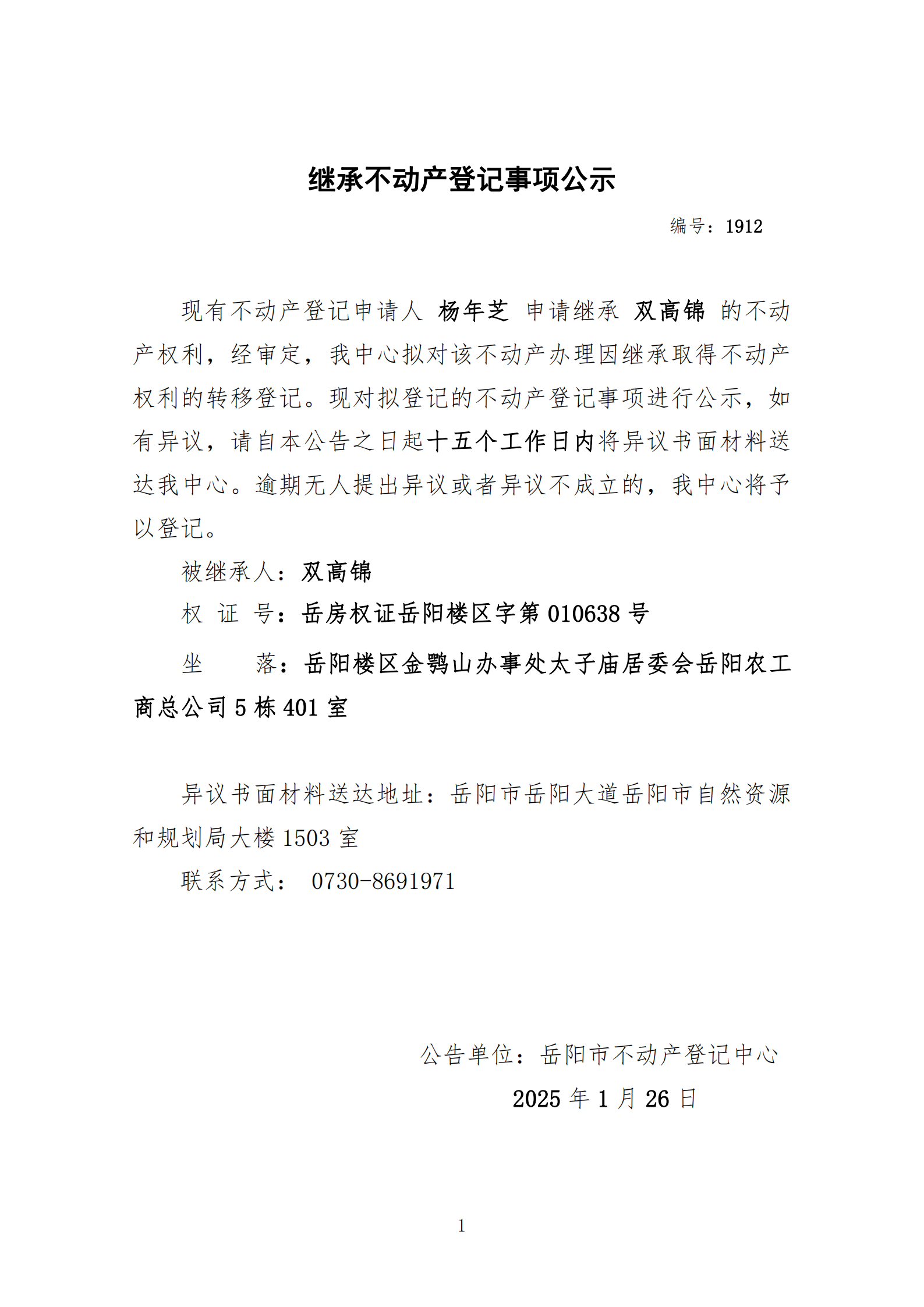 继承不动产登记公示 编号:杨年芝(1912)