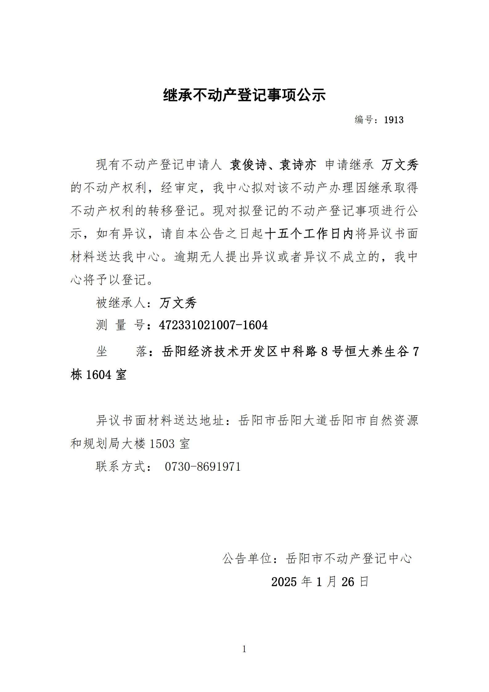 继承不动产登记公示 编号:袁俊诗、袁诗亦(1913)