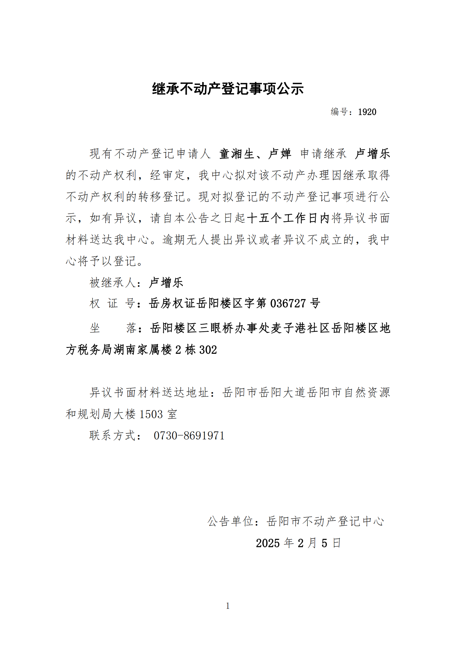 继承不动产登记公示 编号:童湘生、卢婵(1920)