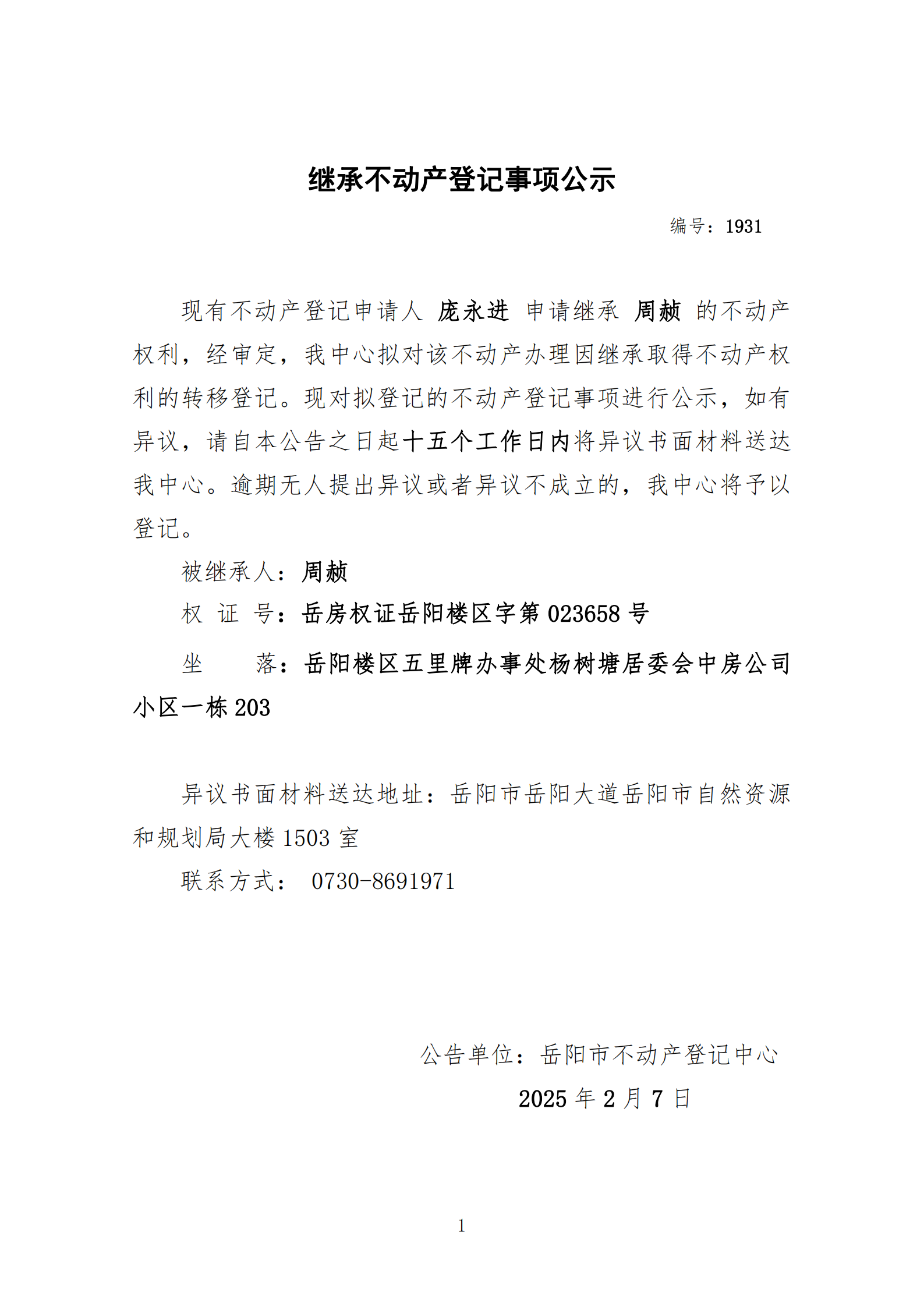 继承不动产登记公示 编号:庞永进(1931)