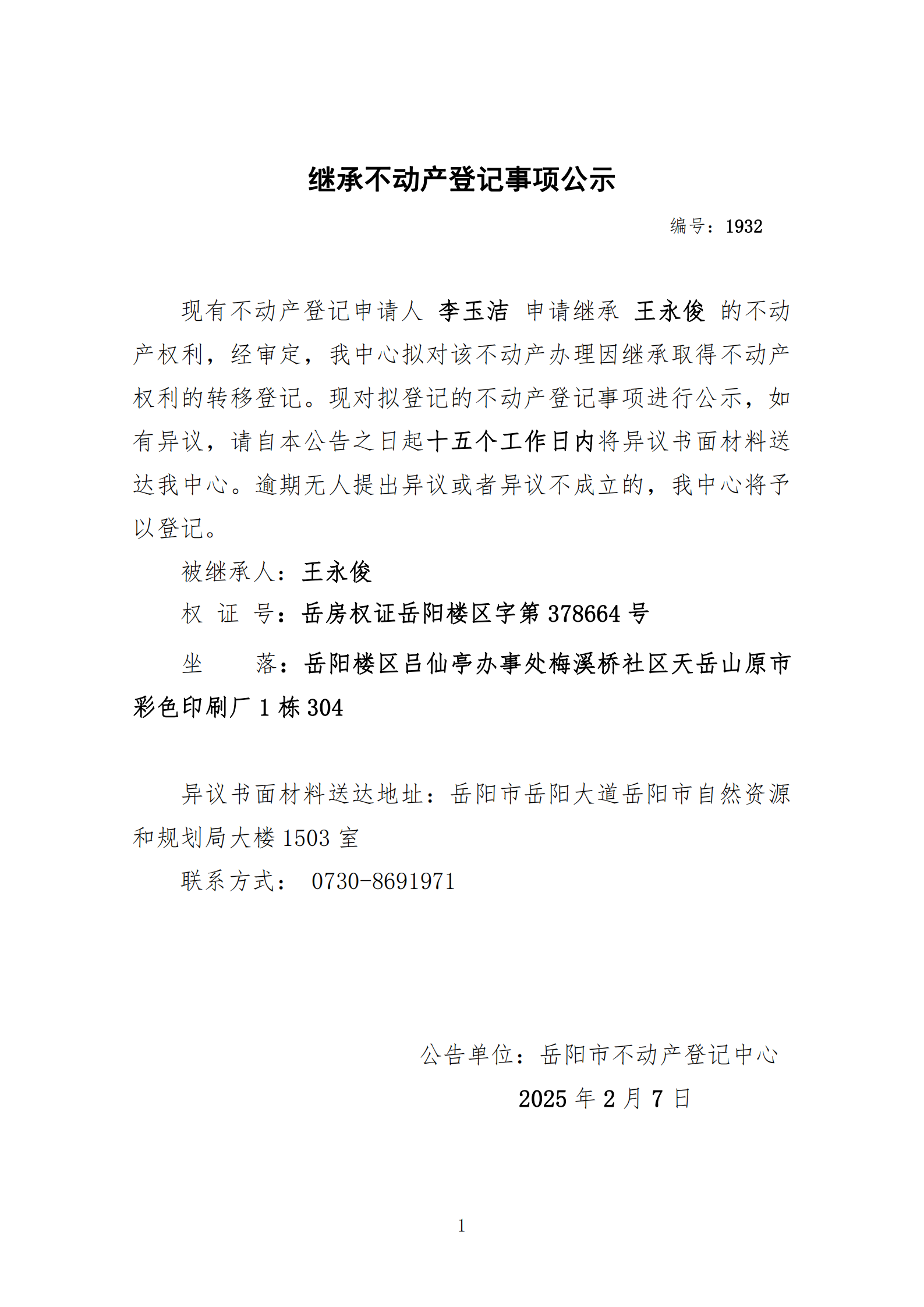 继承不动产登记公示 编号:李玉洁(1932)