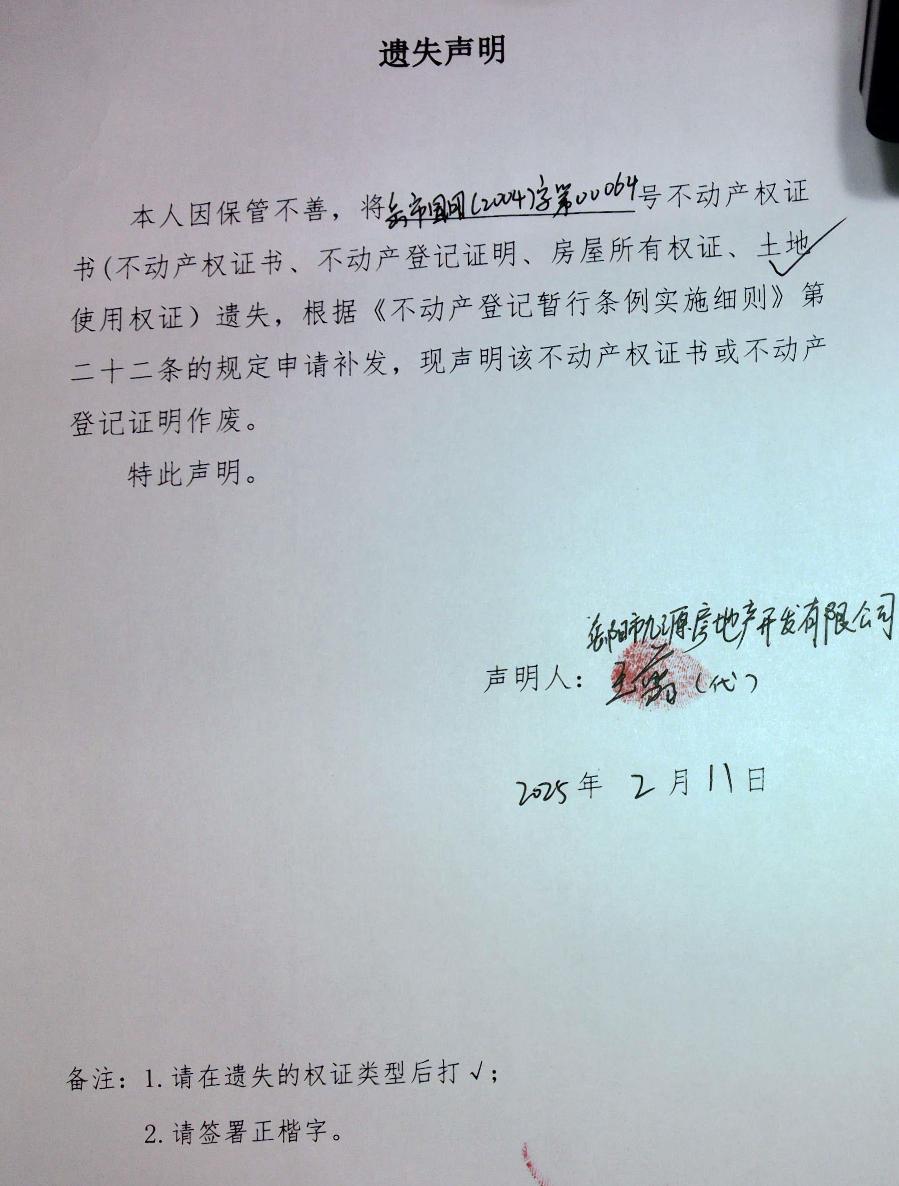 遗失声明( 岳阳市九源房地产开发有限公司 )