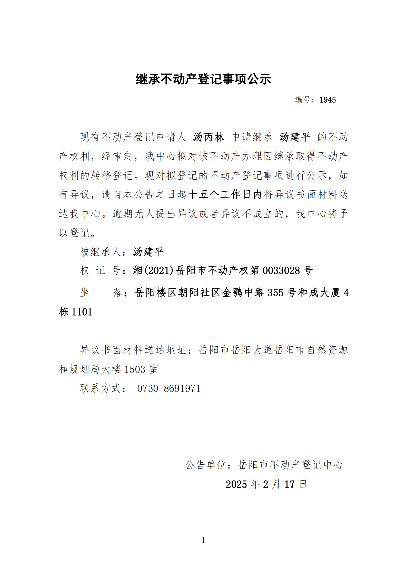 继承不动产登记公示 编号:汤丙林(1945)