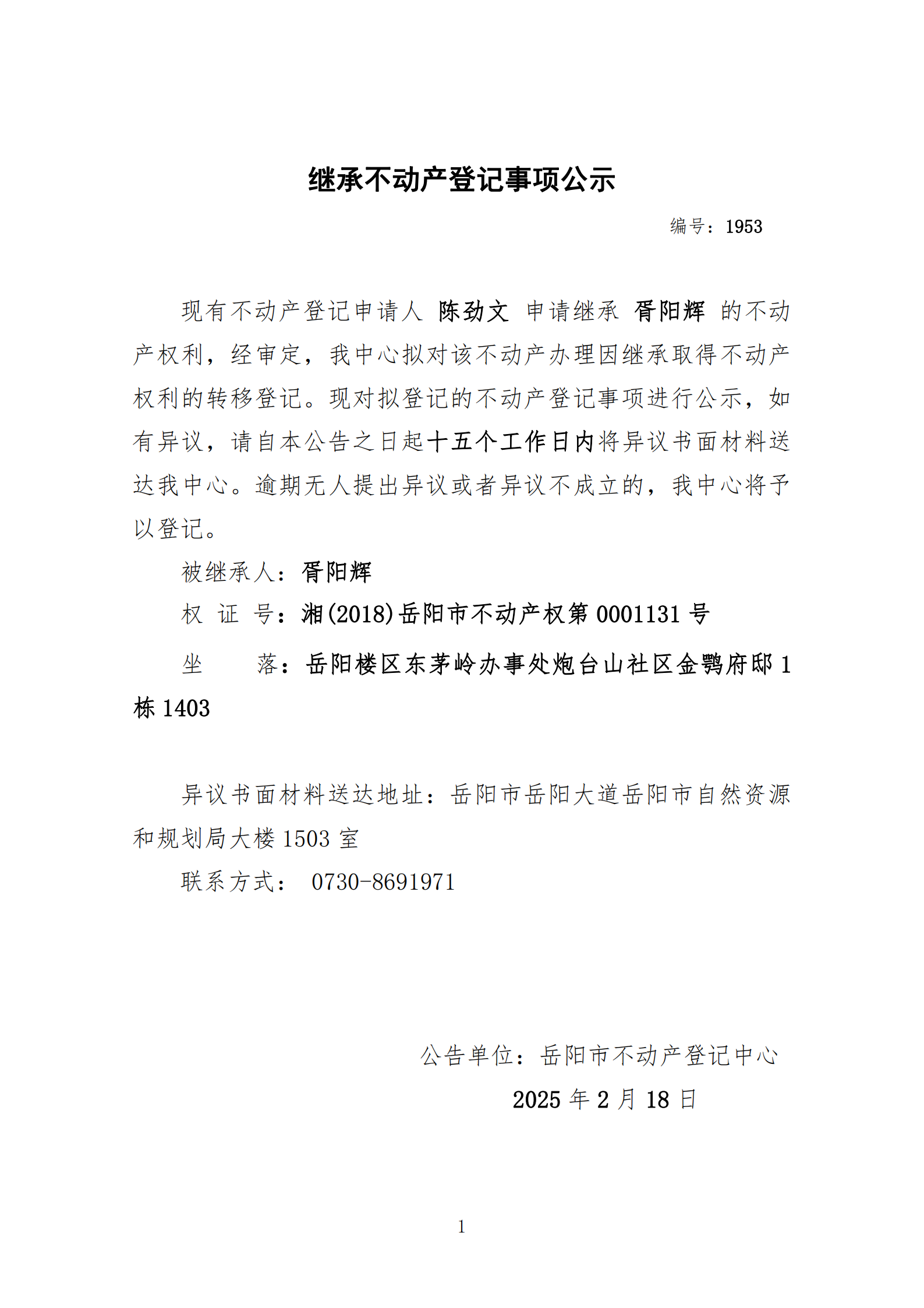 继承不动产登记公示 编号:陈劲文(1953)