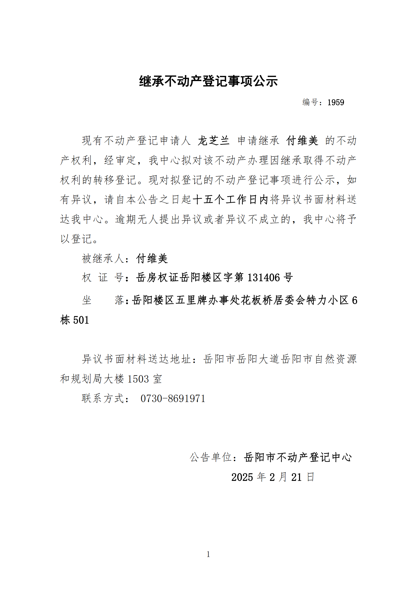 继承不动产登记公示 编号:龙芝兰(1959)