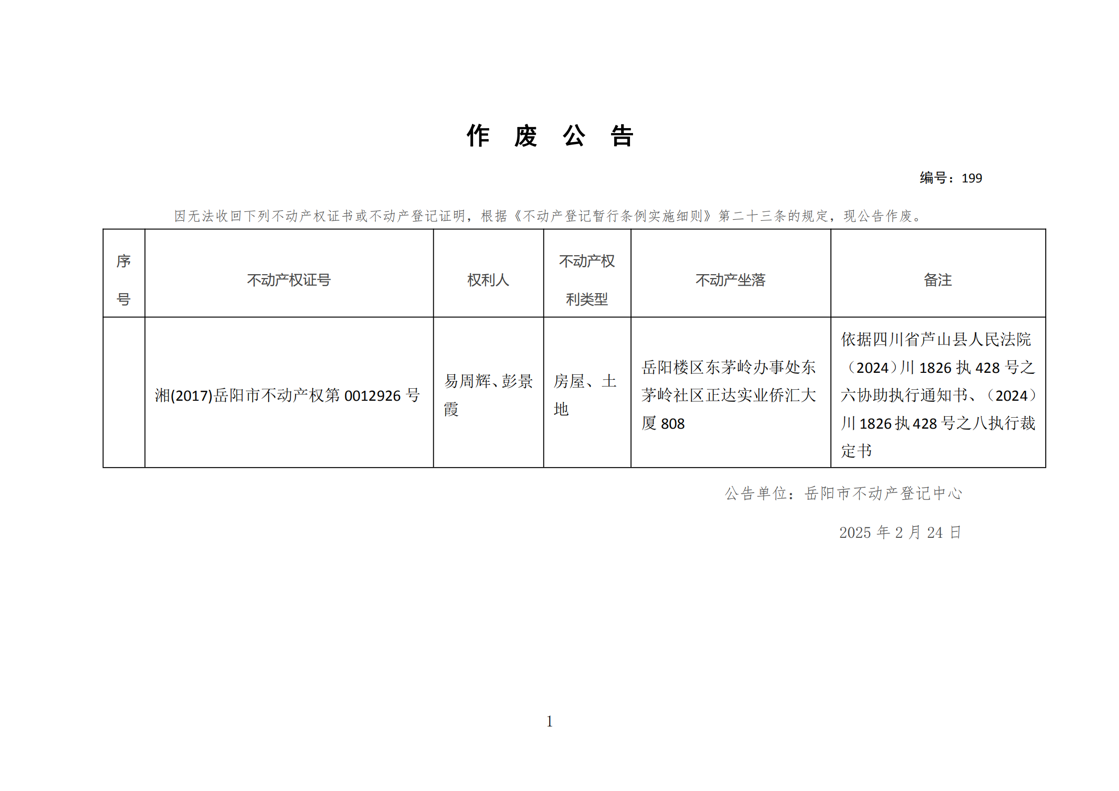 作废公告 编号:易周辉、彭景霞(199)