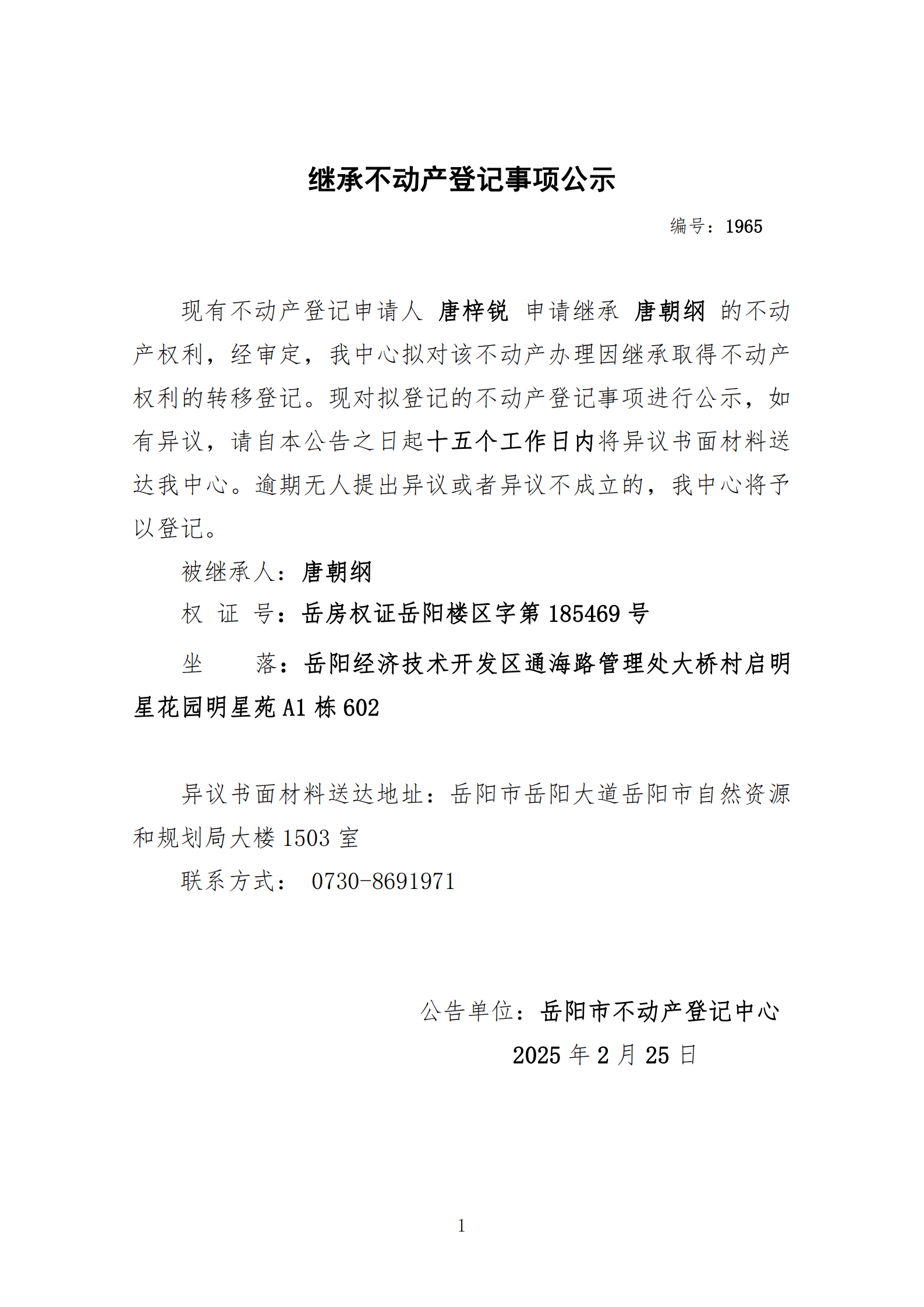 继承不动产登记公示 编号:唐梓锐(1965)