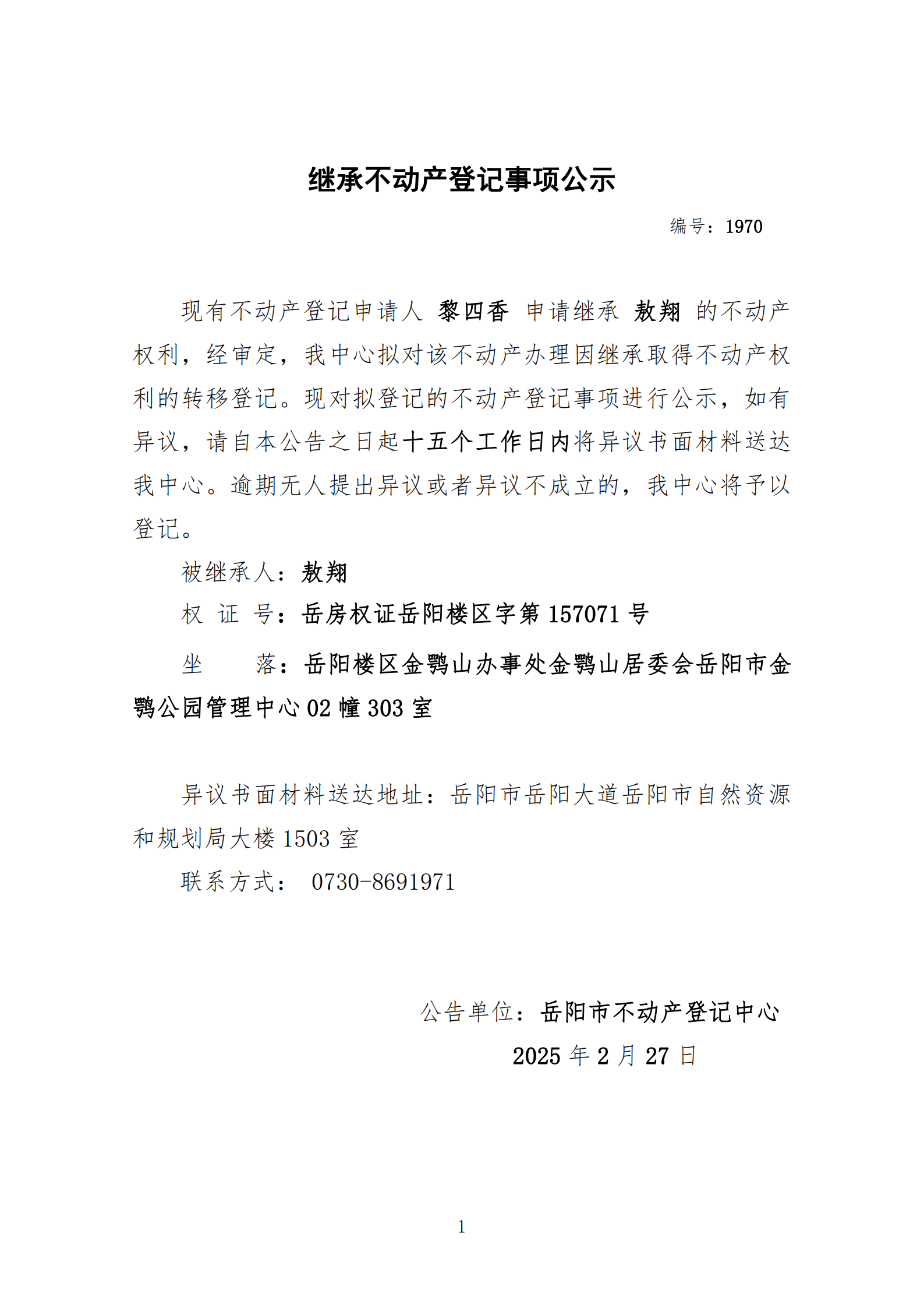 继承不动产登记公示 编号:黎四香(1970)
