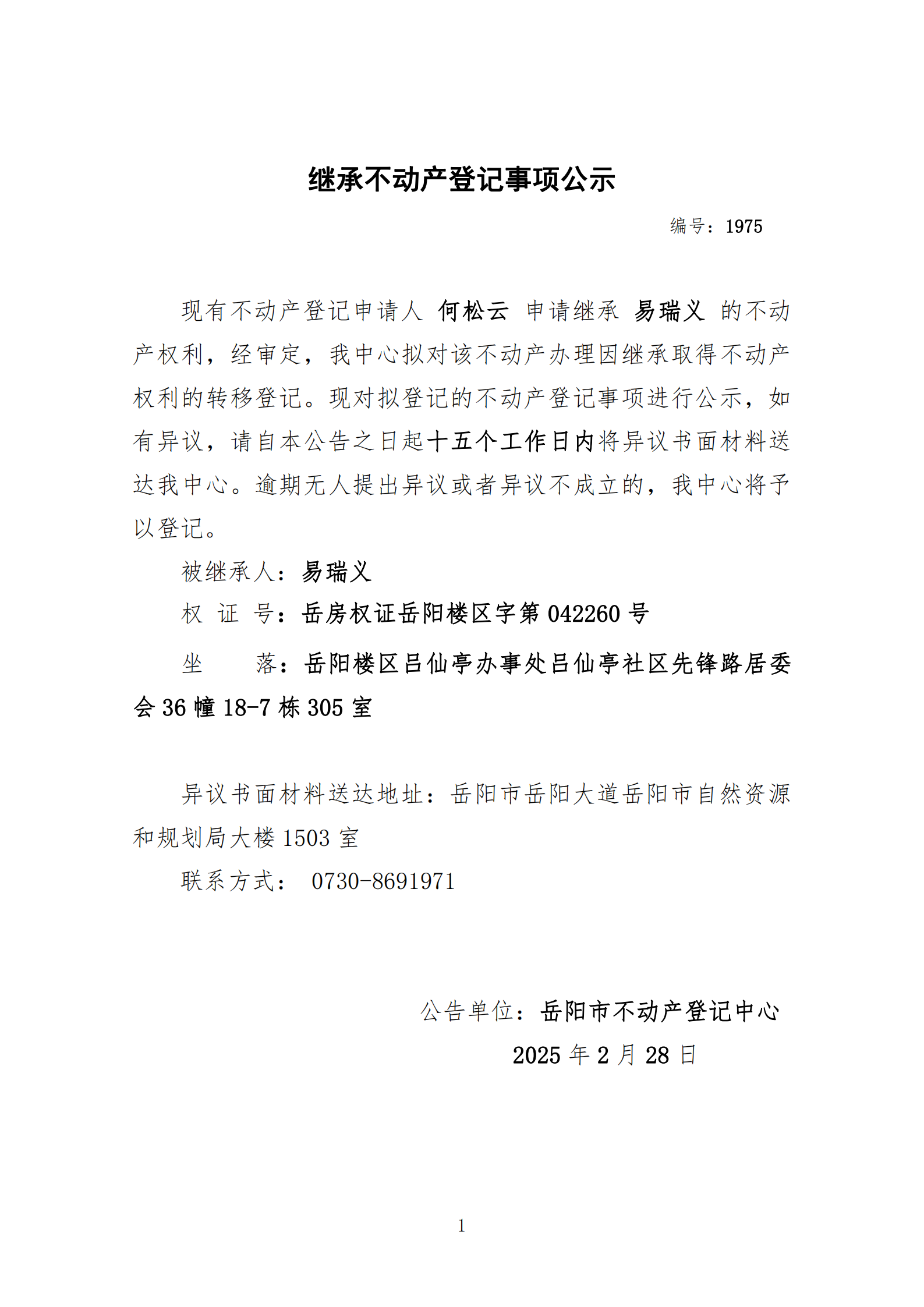 继承不动产登记公示 编号:何松云(1975)