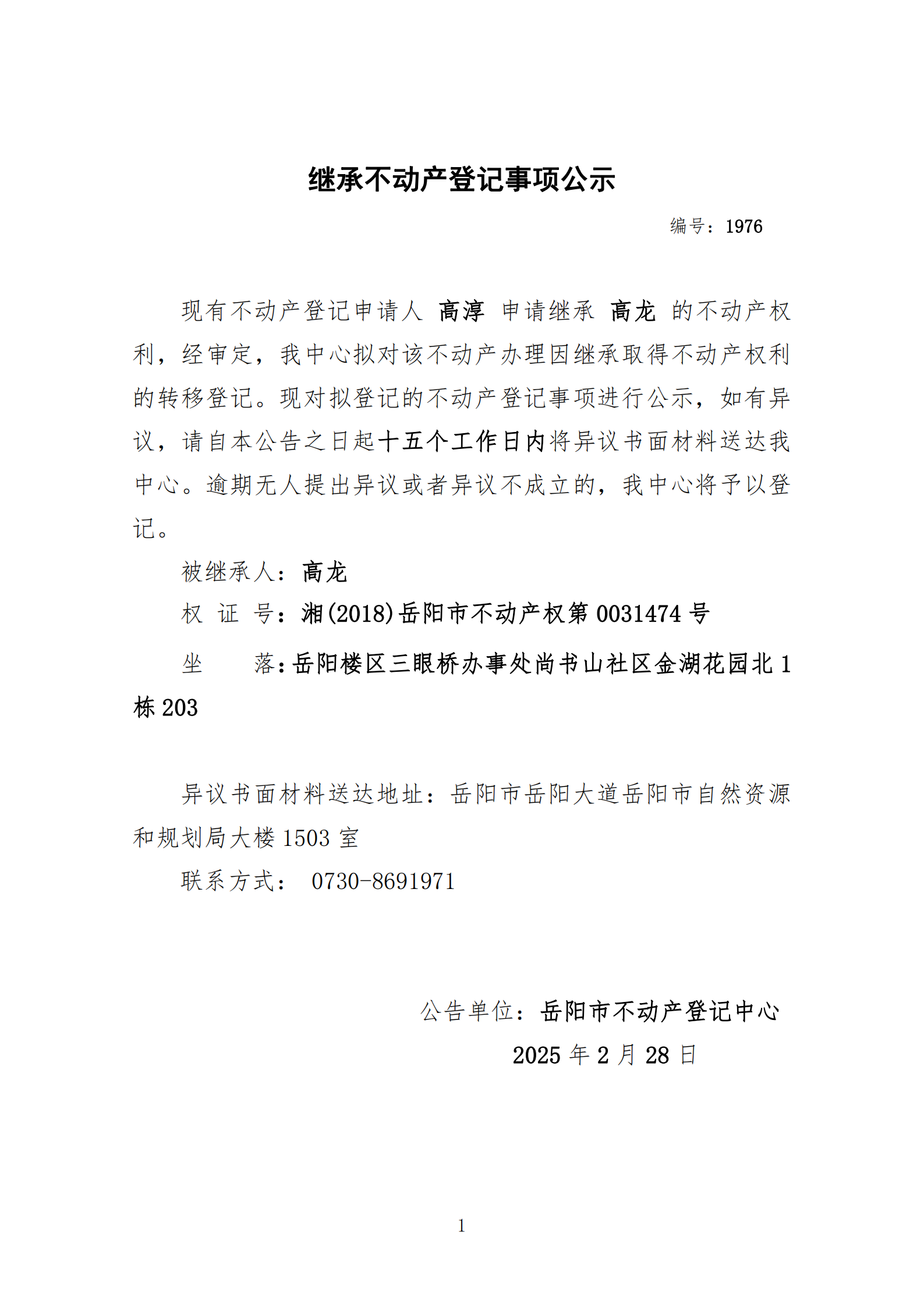 继承不动产登记公示 编号:高淳(1976)