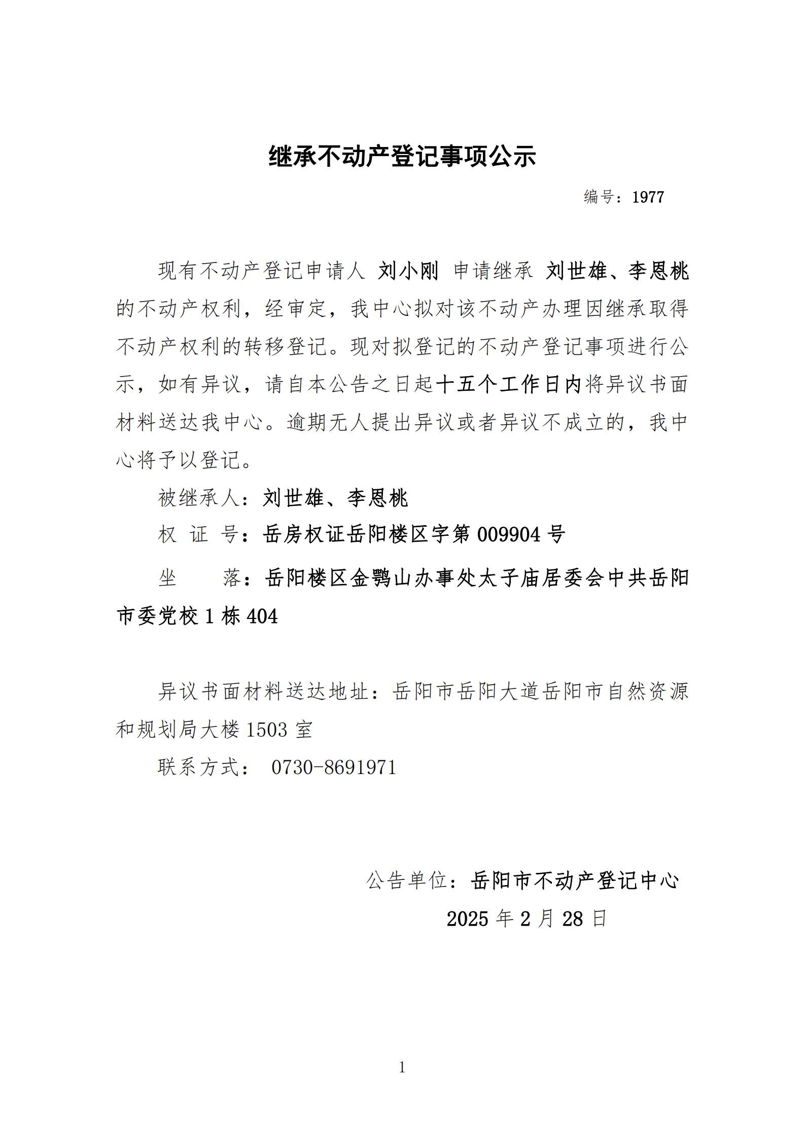 继承不动产登记公示 编号:刘小刚(1977)