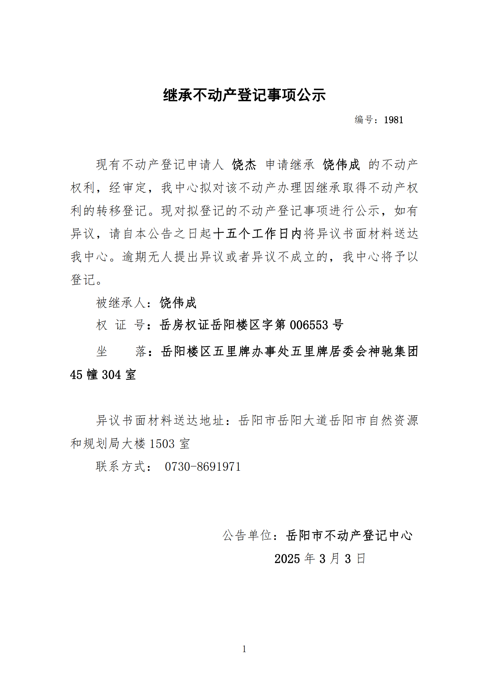 继承不动产登记公示 编号:饶杰(1981)