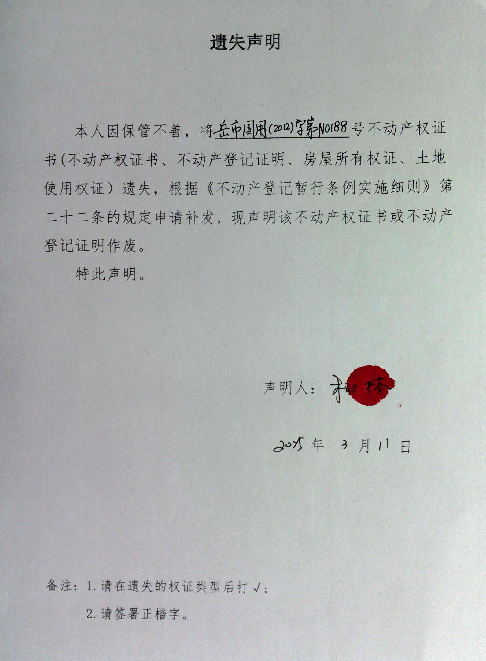 遗失声明(柳林)