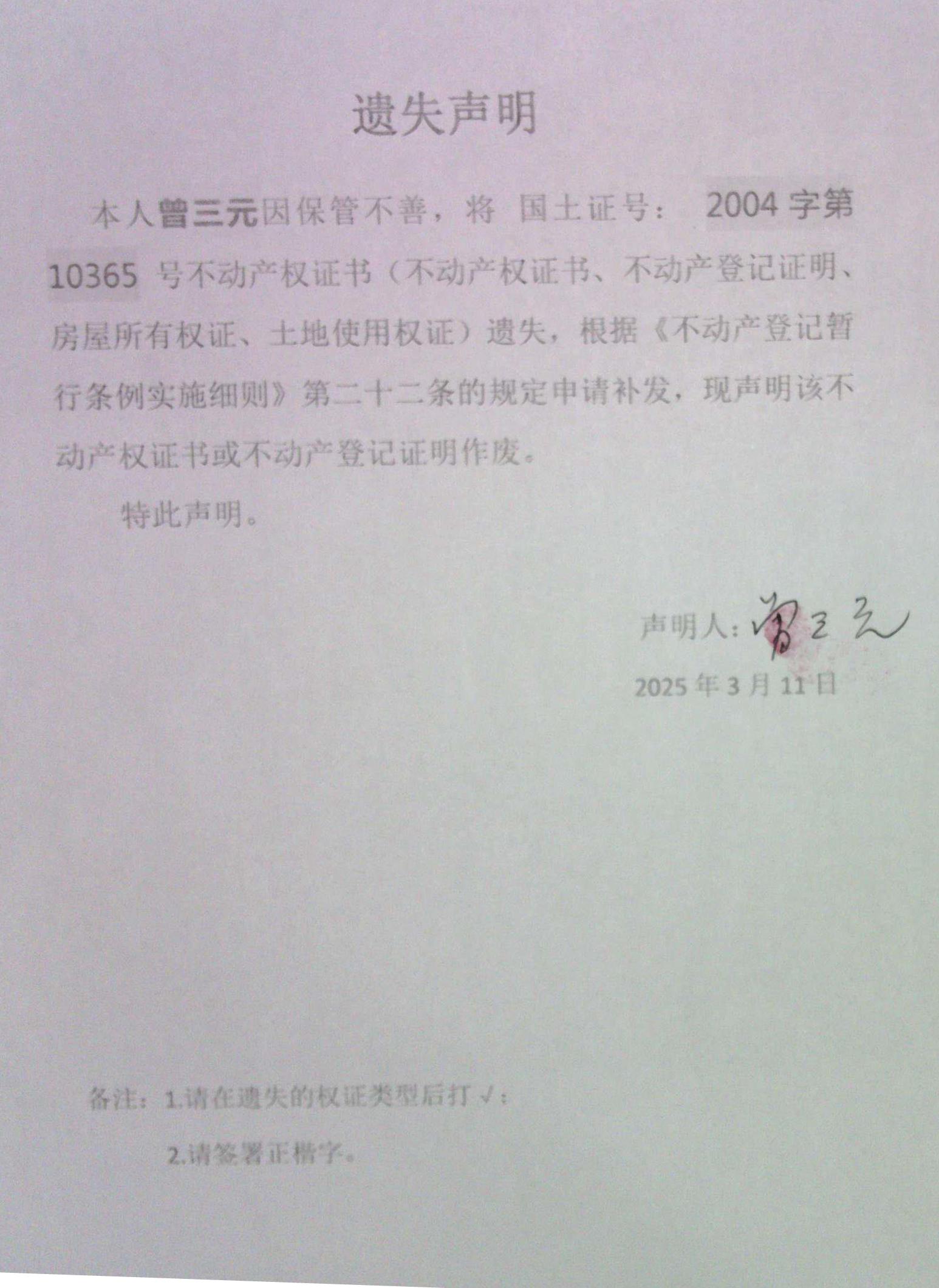 遗失声明(曾三元 )