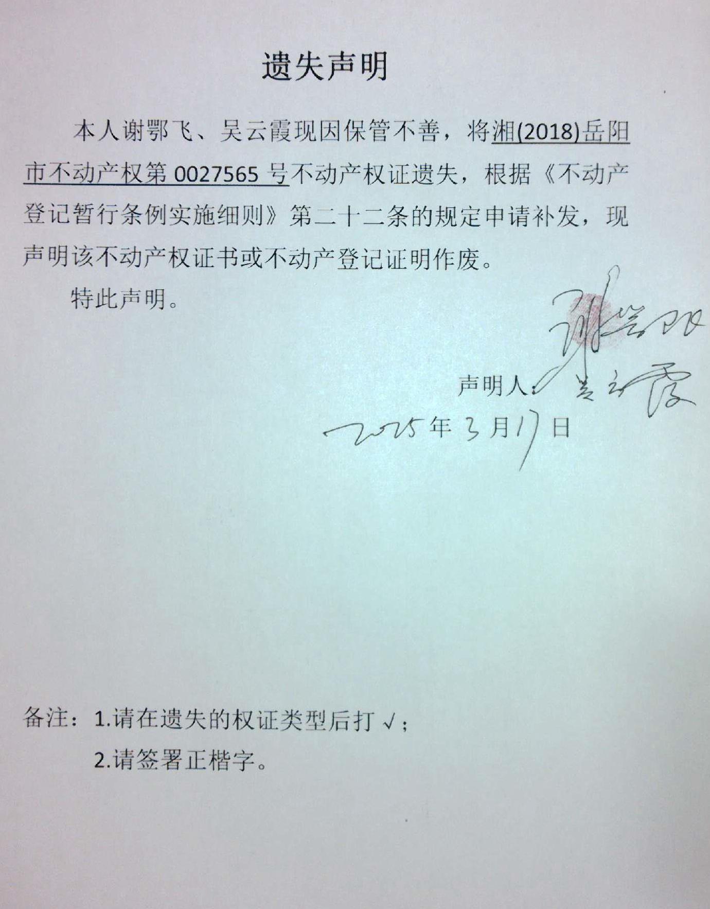 遗失声明(谢鄂飞、吴云霞)