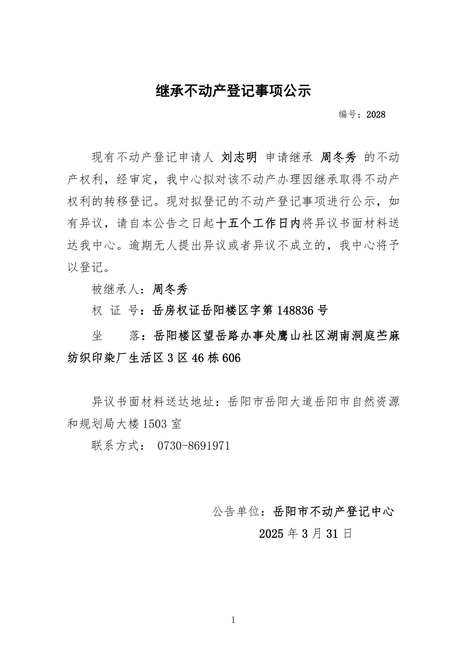 继承不动产登记公示 编号:刘志明(2028)