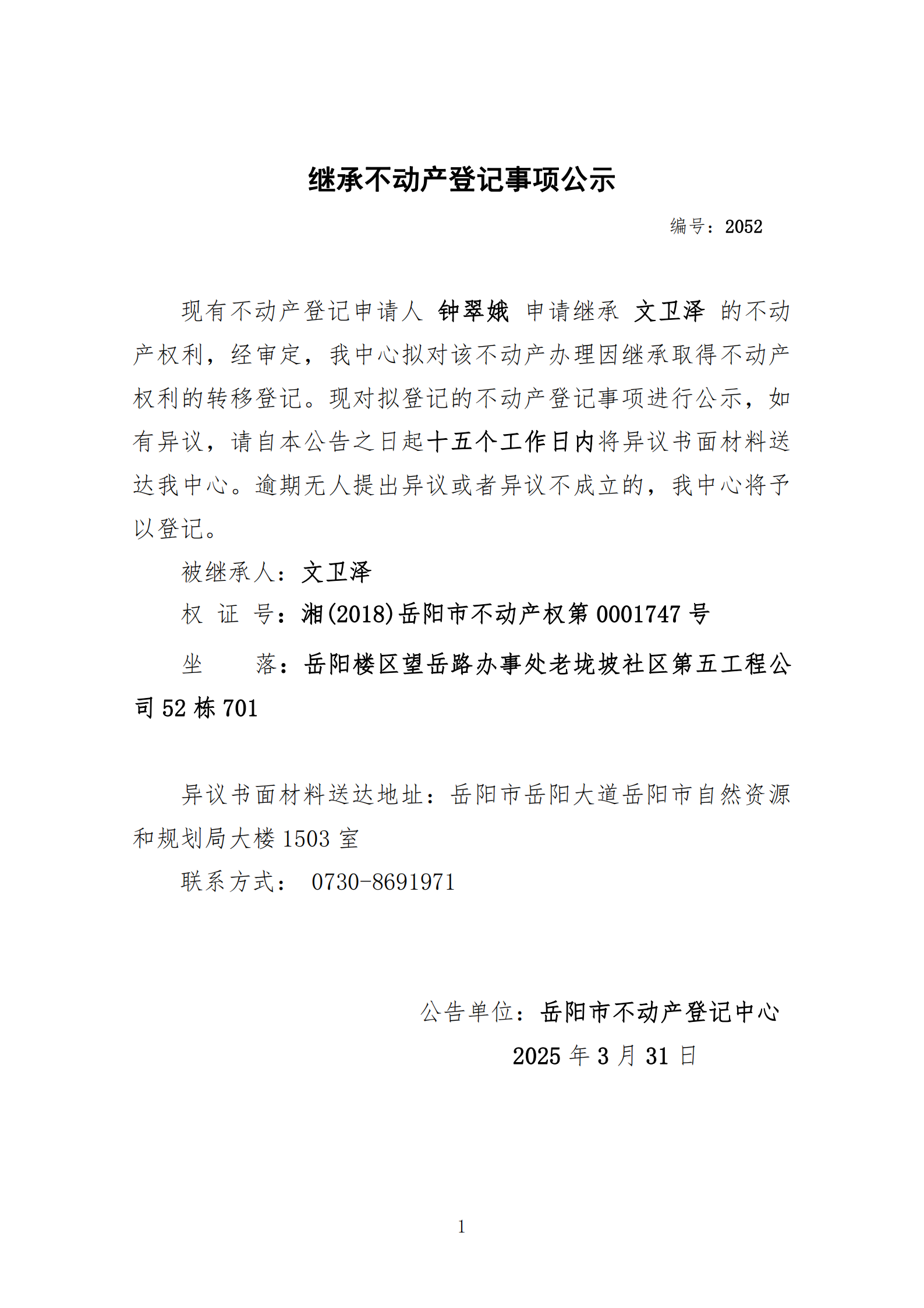 继承不动产登记公示 编号:钟翠娥(2052)