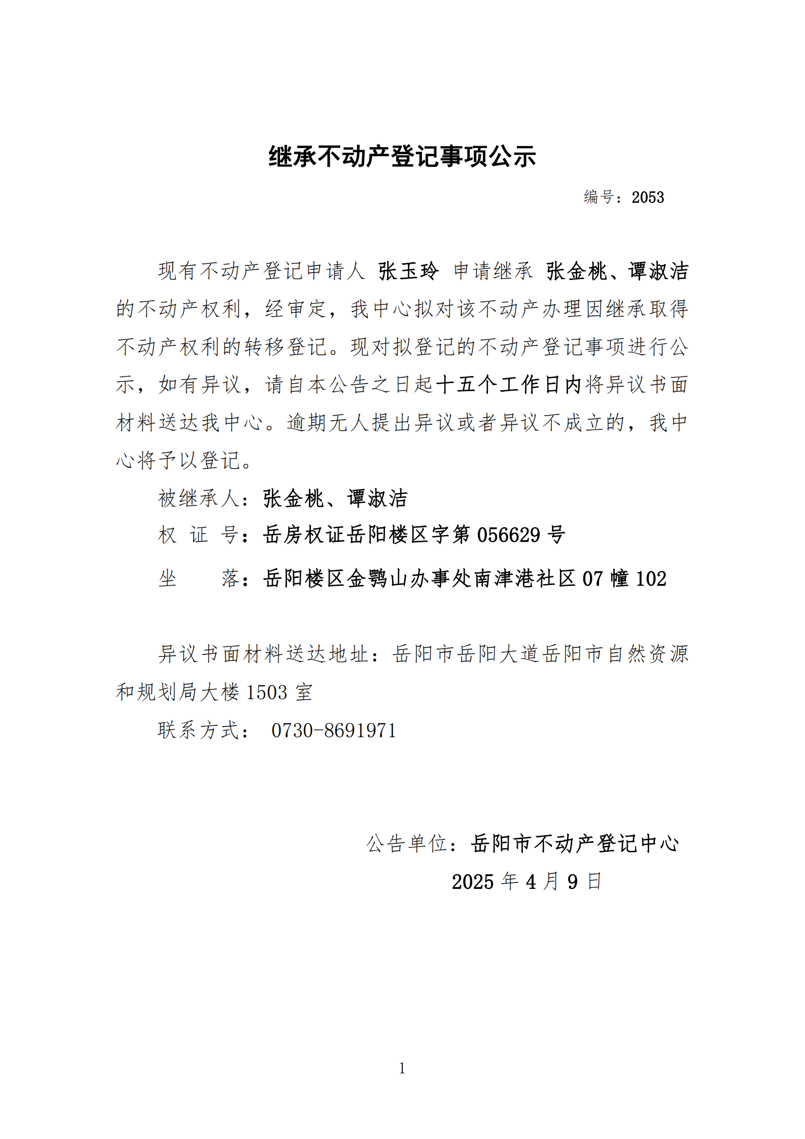 继承不动产登记公示 编号:张玉玲(2053)