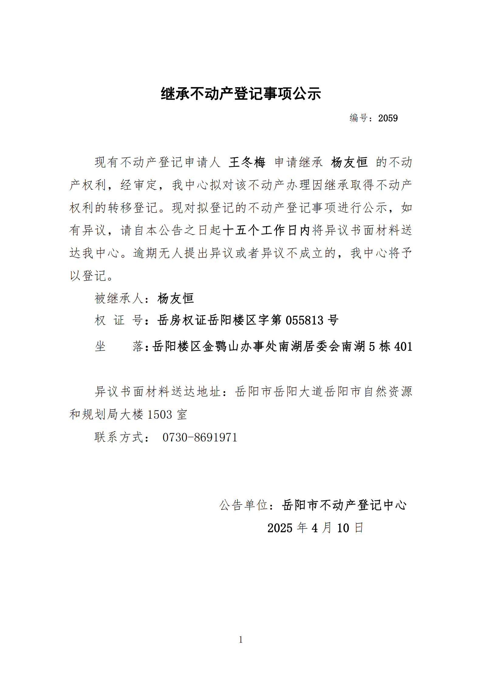 继承不动产登记公示 编号:王冬梅(2059)