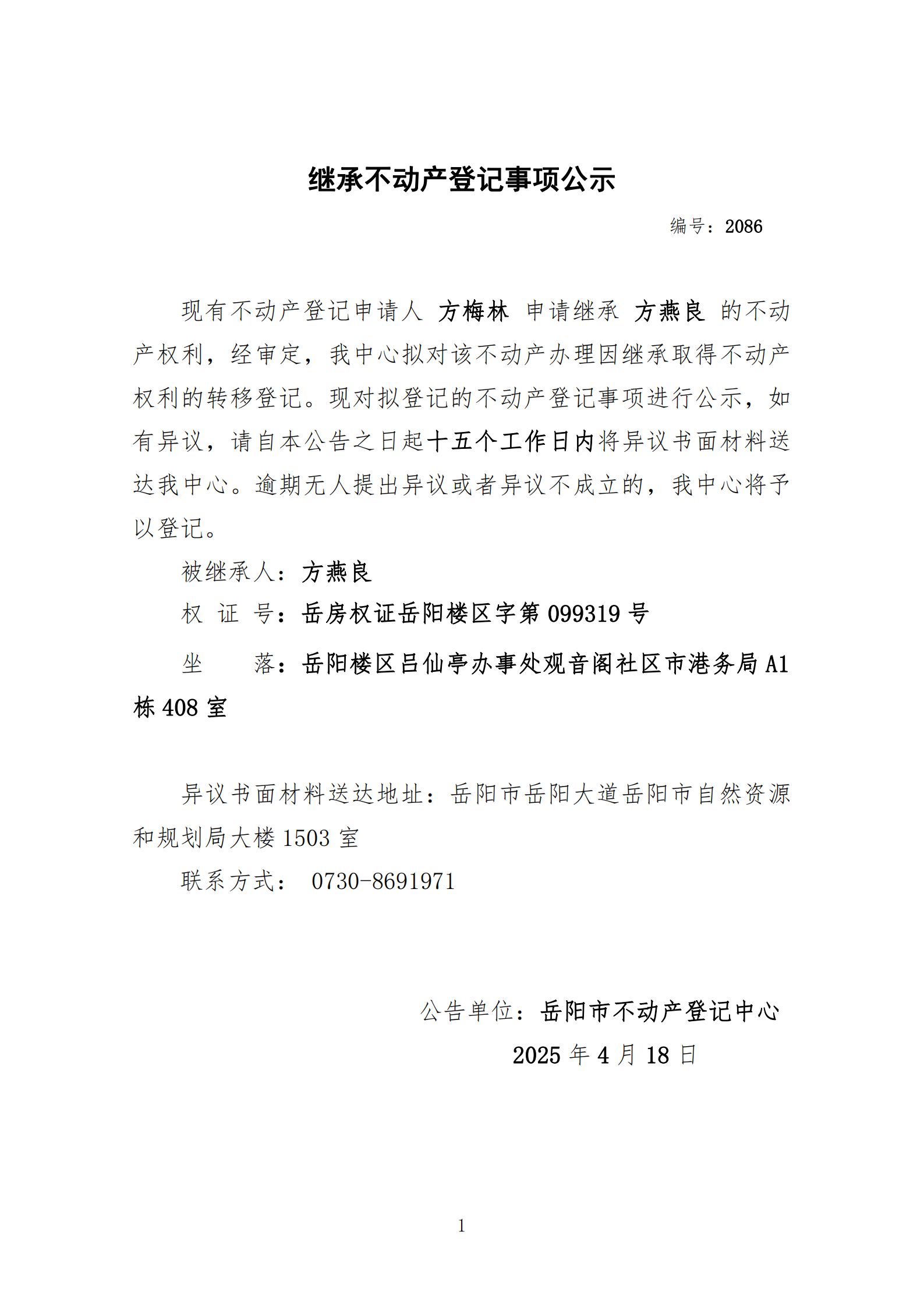 继承不动产登记公示 编号:方梅林(2086)