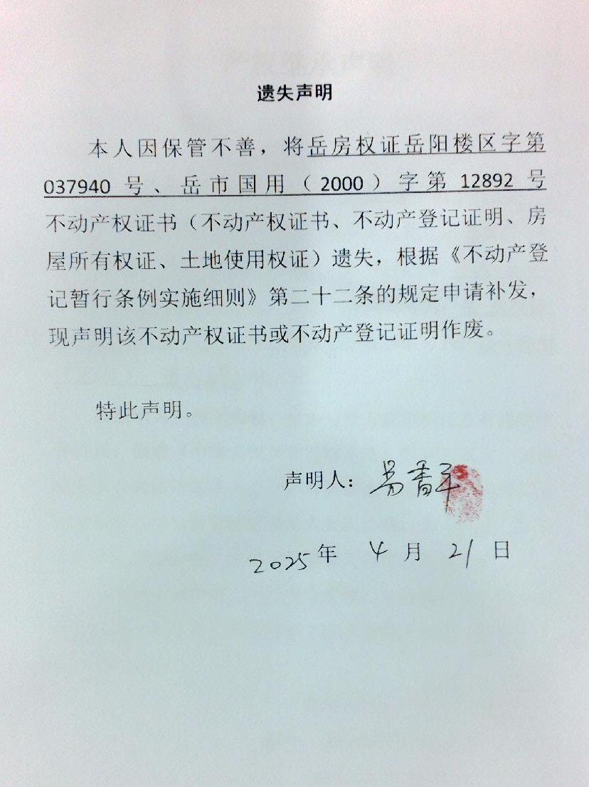 遗失声明(易香平)