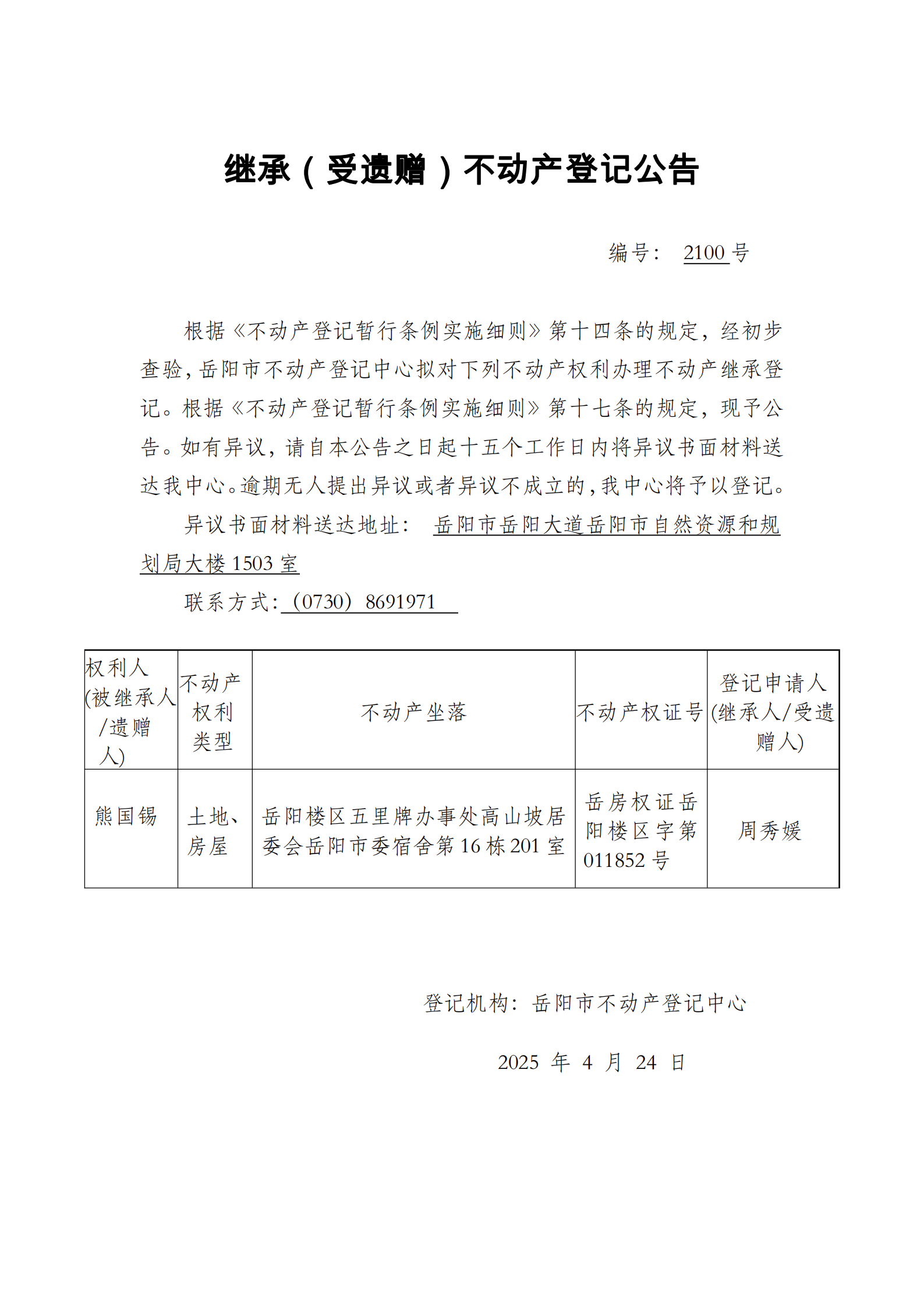继承(受遗赠)不动产登记公告 编号:周秀媛(2100)