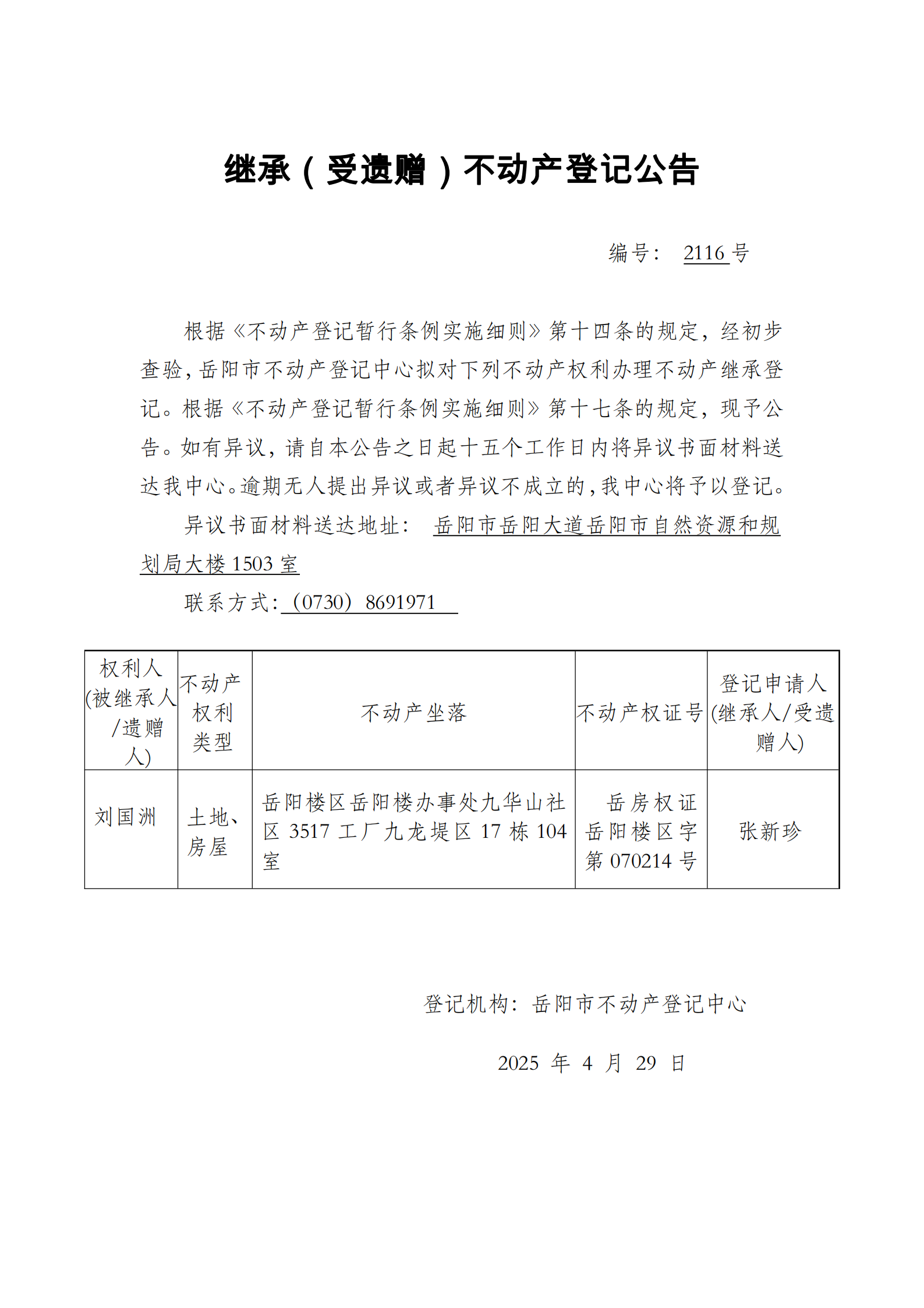 继承(受遗赠)不动产登记公告 编号:张新珍(2116)