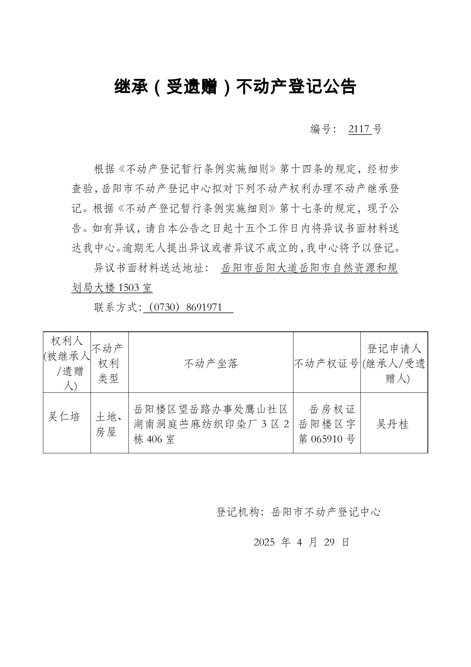 继承(受遗赠)不动产登记公告 编号:吴丹桂(2117)