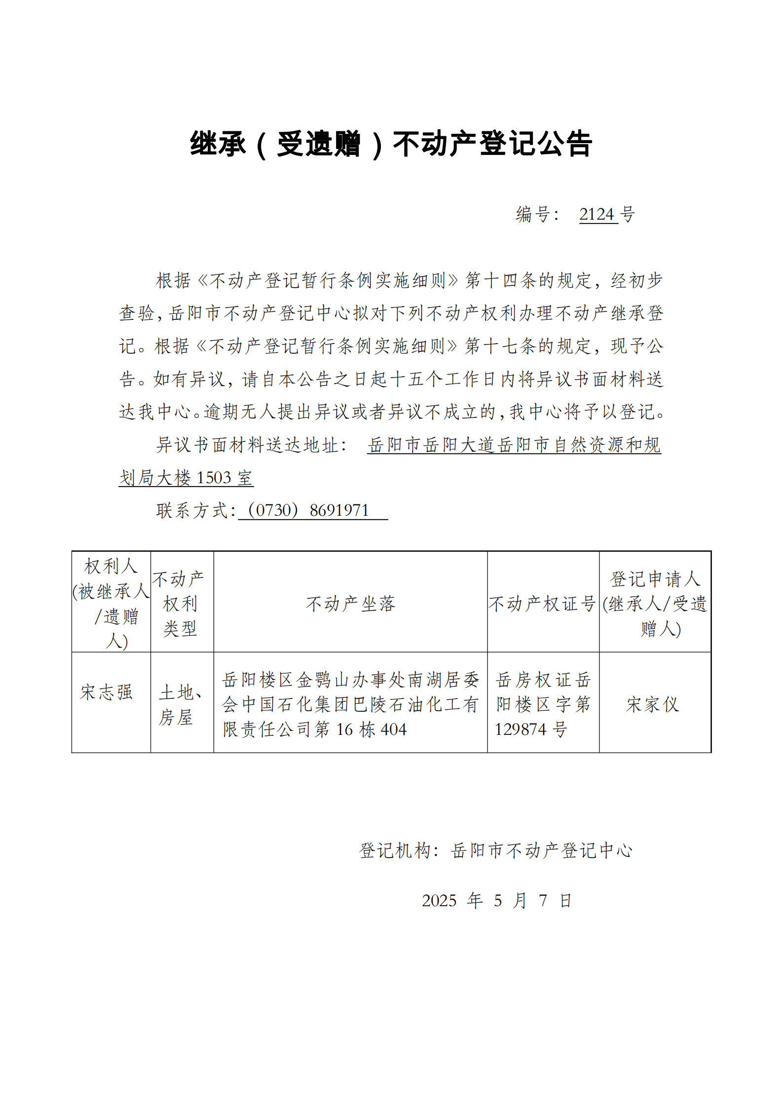 继承(受遗赠)不动产登记公告 编号:宋家仪(2124)