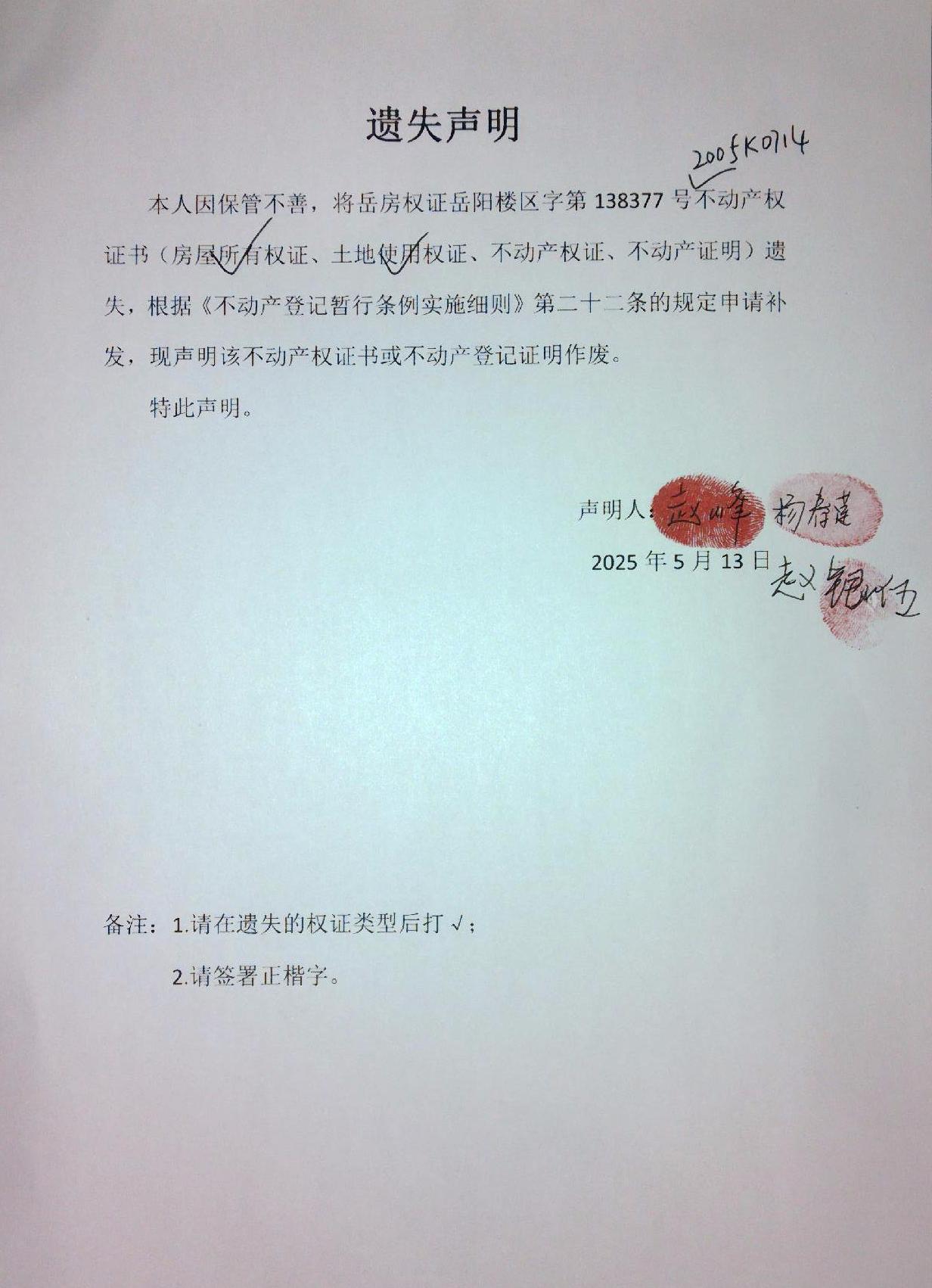 遗失声明(赵峰、杨春莲、赵银伍)2