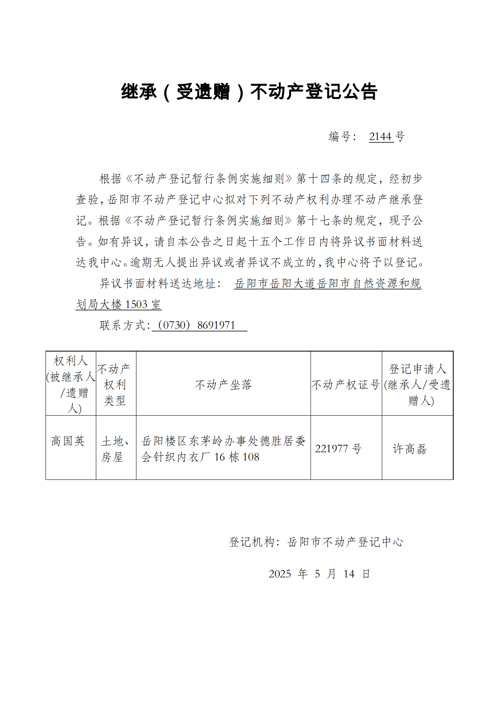 继承(受遗赠)不动产登记公告 编号:许高磊(2144)