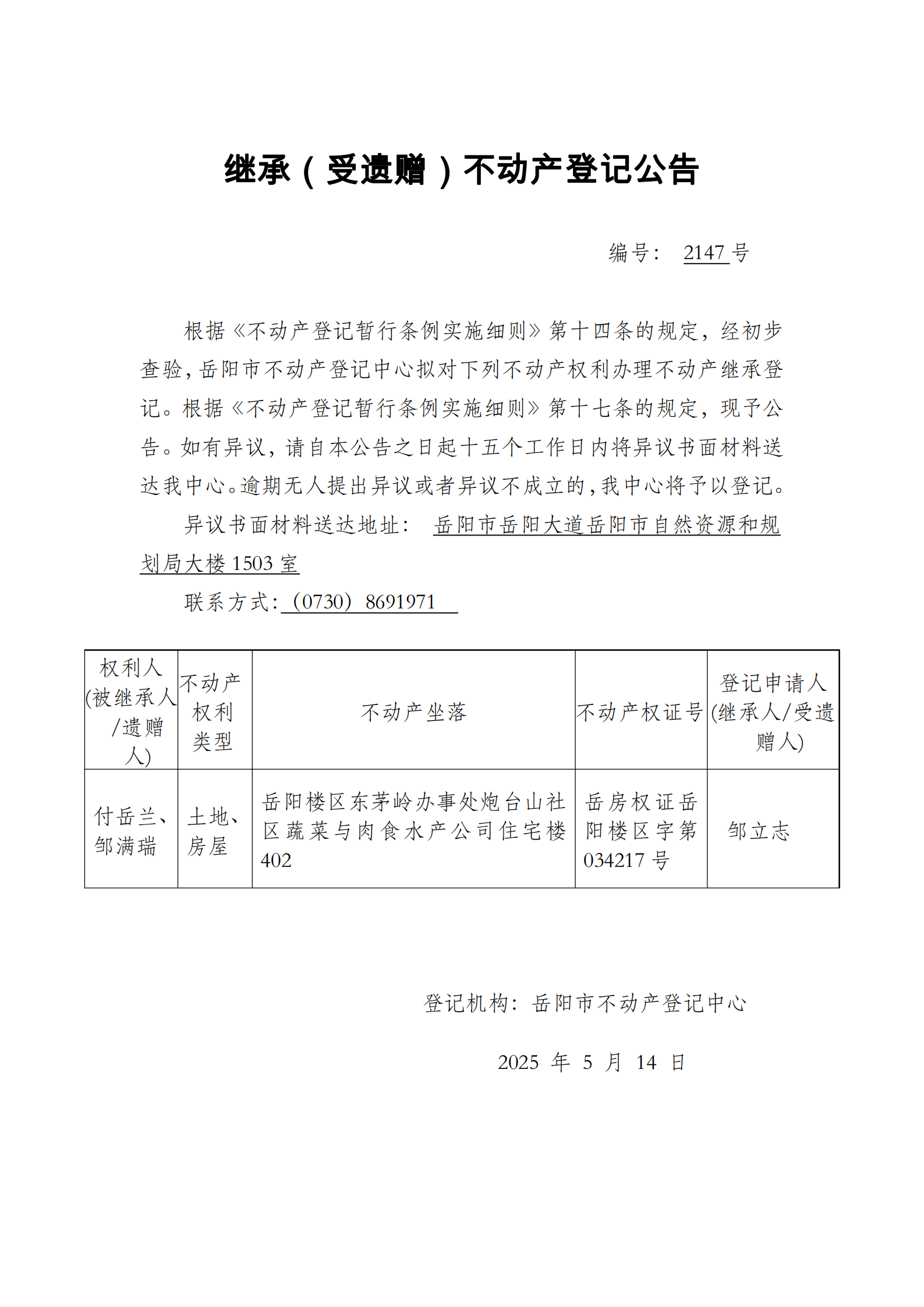 继承(受遗赠)不动产登记公告 编号:邹立志(2147)