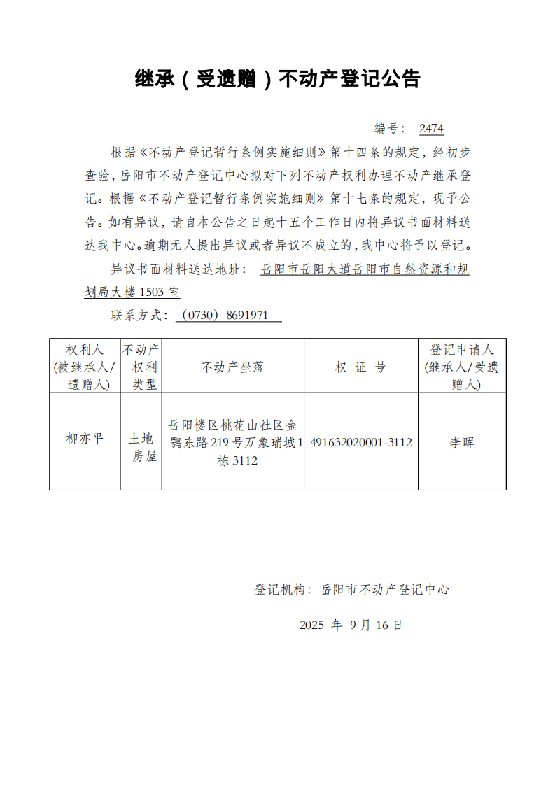 继承(受遗赠)不动产登记公告 编号:李晖 (2474)