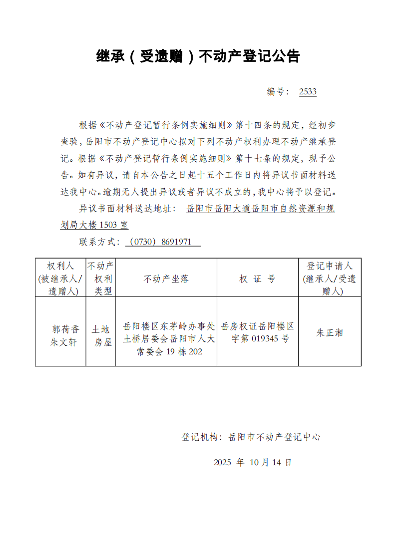 继承(受遗赠)不动产登记公告 编号:朱正湘(2533)
