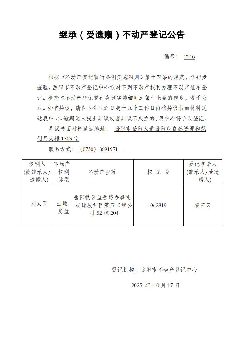 继承(受遗赠)不动产登记公告 编号:黎玉云(2546)