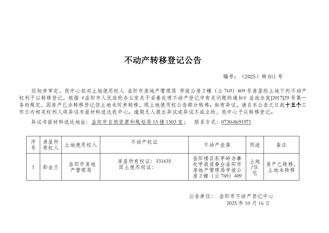 不动产转移登记公告 编号: 岳阳市房地产管理局(2025)转011