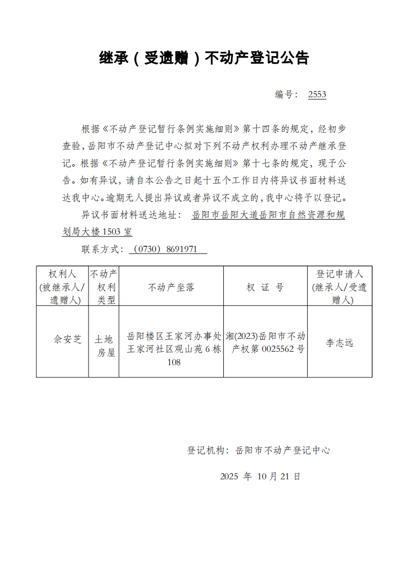 继承(受遗赠)不动产登记公告 编号:李志远(2553)