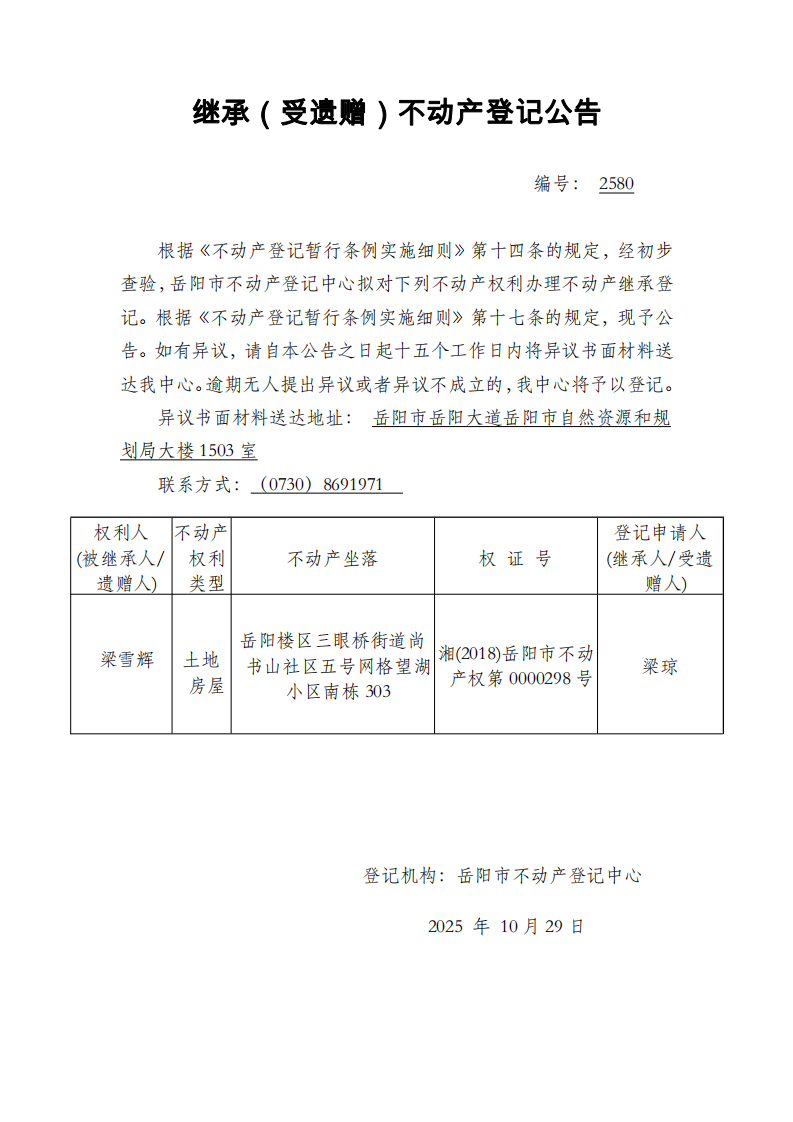 继承(受遗赠)不动产登记公告 编号:梁琼(2580)