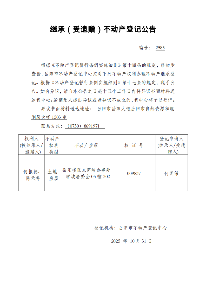 继承(受遗赠)不动产登记公告 编号:何国保(2585)