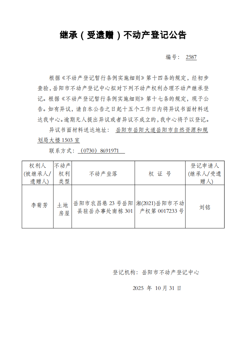 继承(受遗赠)不动产登记公告 编号:刘铭(2587)