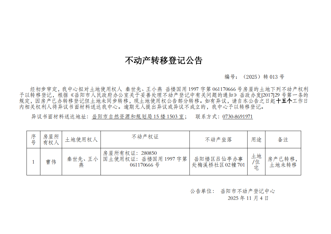 不动产转移登记公告 编号:秦世先、王小燕(2025)转013