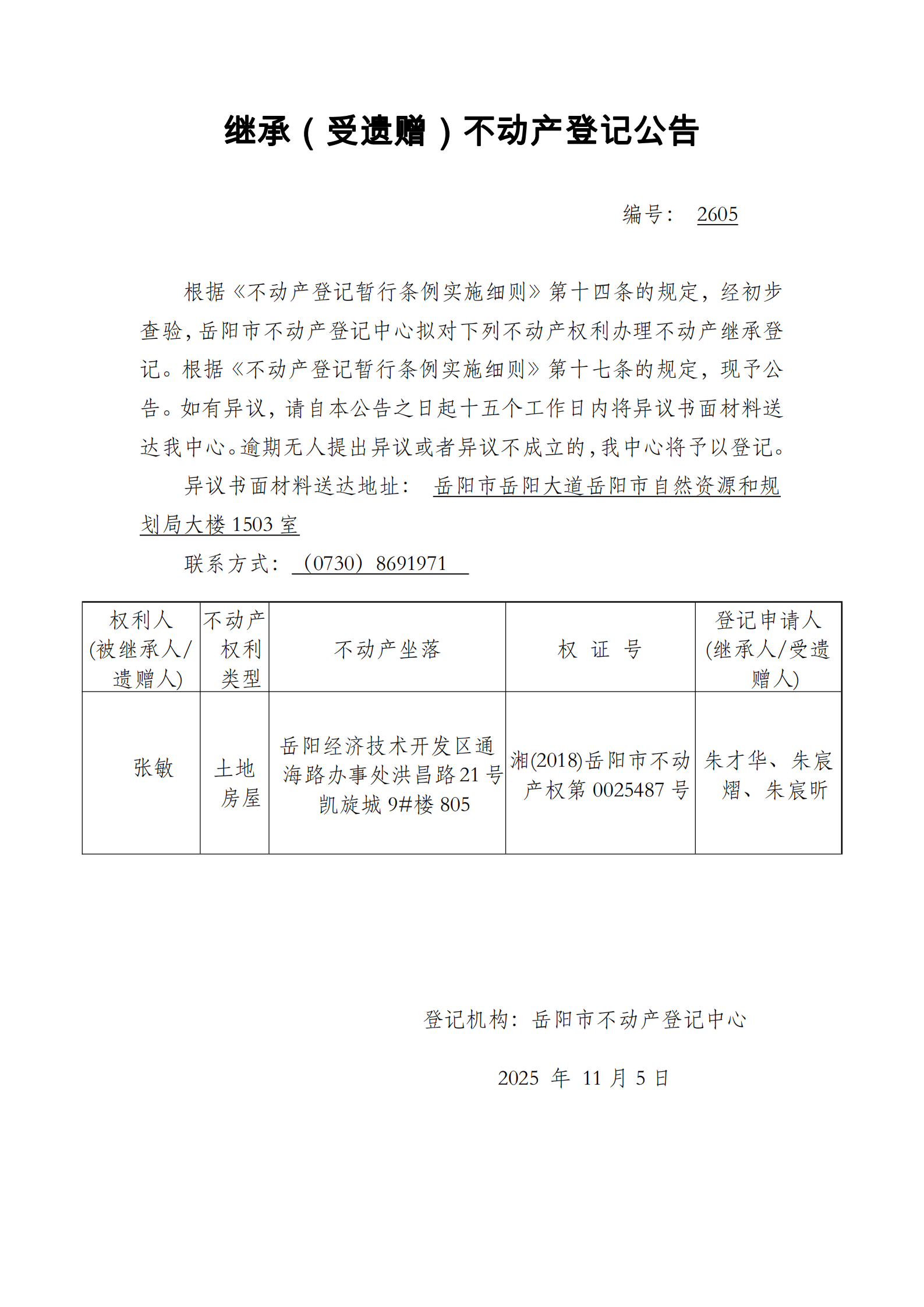 继承(受遗赠)不动产登记公告 编号:朱才华、朱宸熠、朱宸昕(2605)