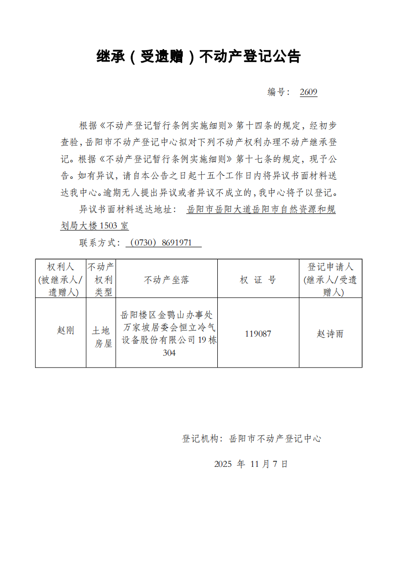 继承(受遗赠)不动产登记公告 编号:赵诗雨(2609)