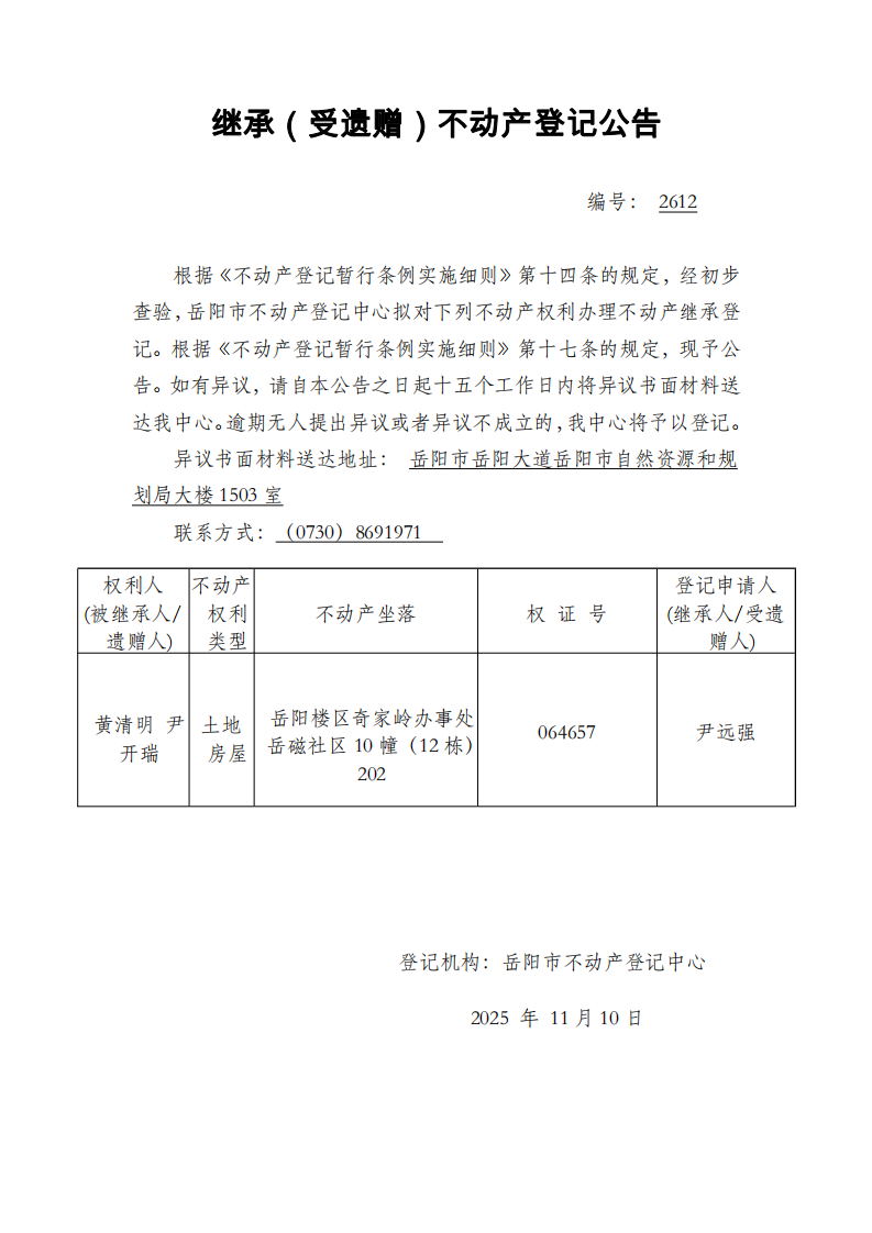 继承(受遗赠)不动产登记公告 编号:尹远强(2612)