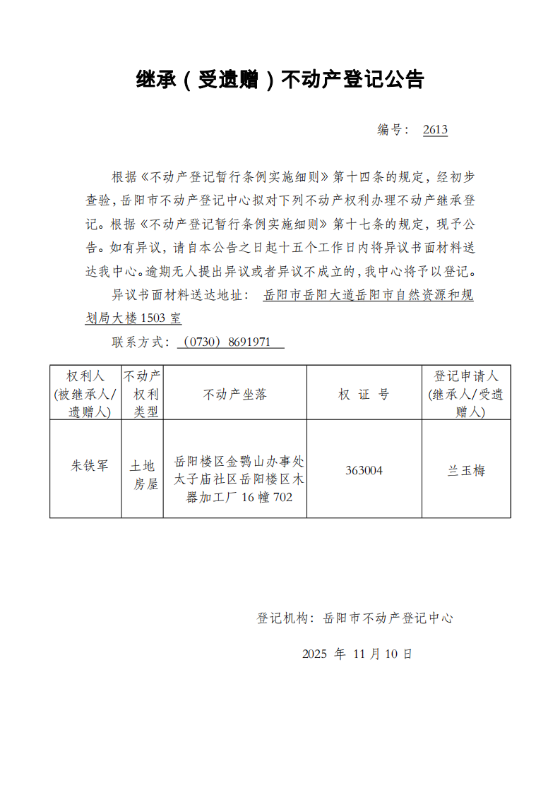 继承(受遗赠)不动产登记公告 编号:兰玉梅(2613)